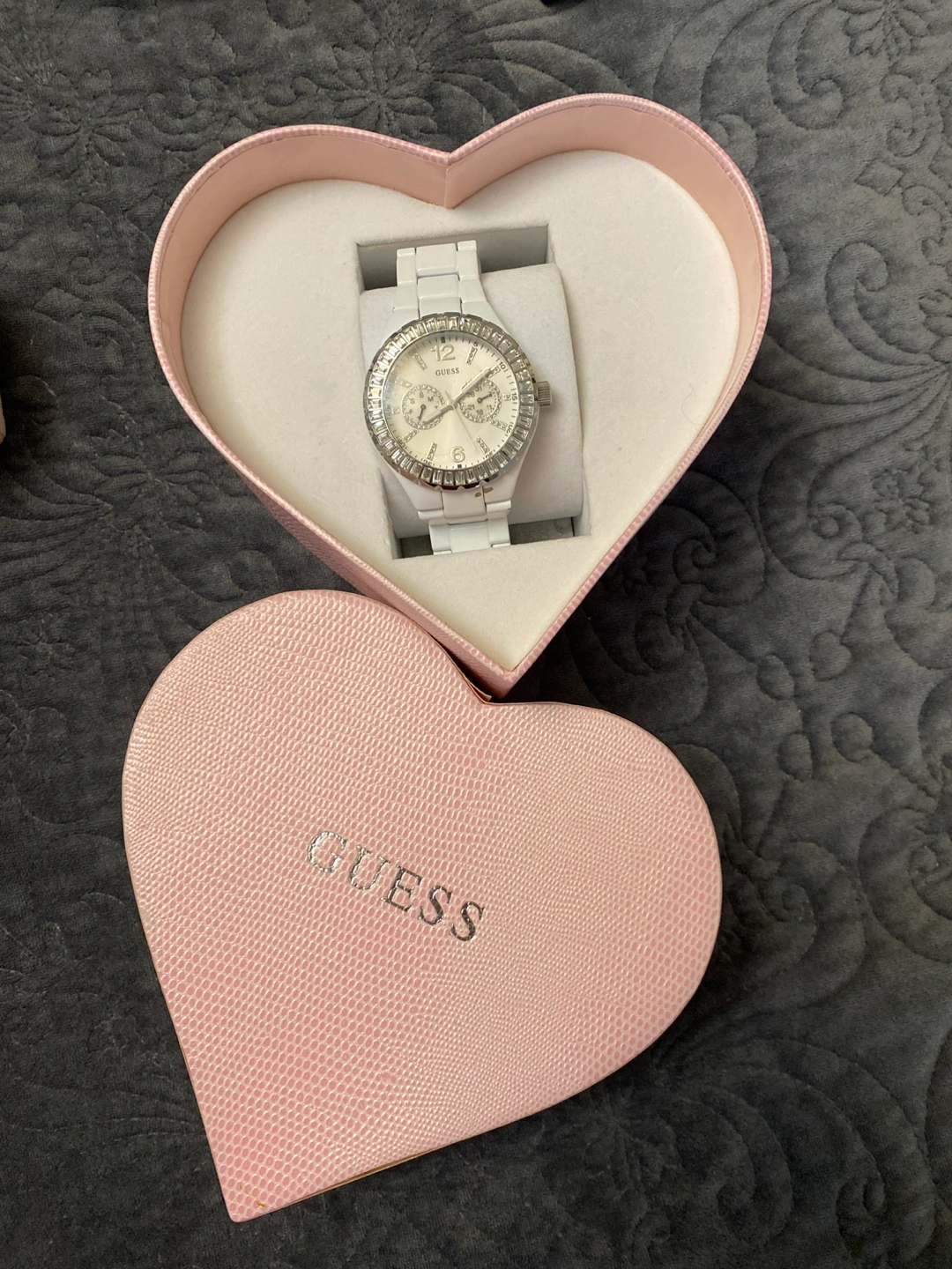 Beautiful Guess watch. White ceramic band and face. Silver-toned accents. Comes in original heart-shaped box.