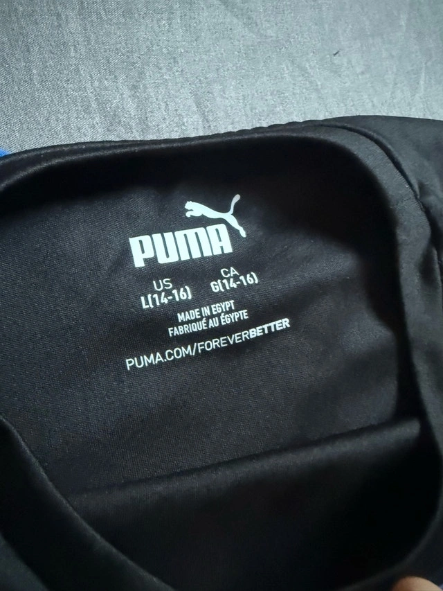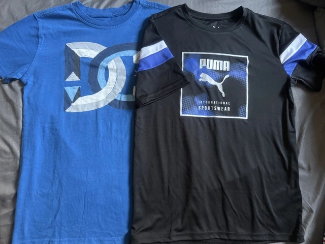 Selling a set of used boy's shirts perfect for everyday wear! This set includes a Puma black and blue athletic shirt, size L (14-16), and a blue DC tee, also size L (14-16). Both shirts have been worn but are still in good condition. No rips or tears. $5 each or both for $8 firm!