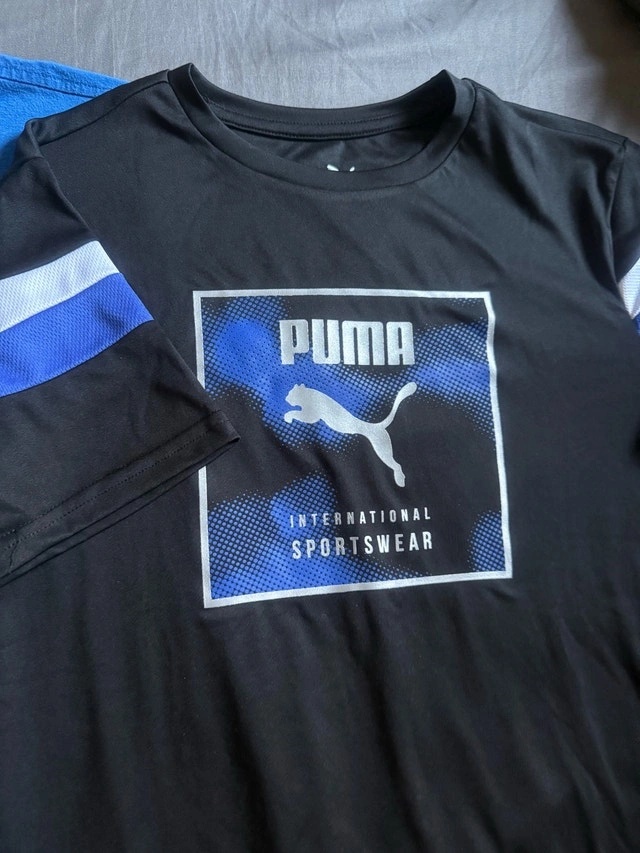 Selling a set of used boy's shirts perfect for everyday wear! This set includes a Puma black and blue athletic shirt, size L (14-16), and a blue DC tee, also size L (14-16). Both shirts have been worn but are still in good condition. No rips or tears. $5 each or both for $8 firm!