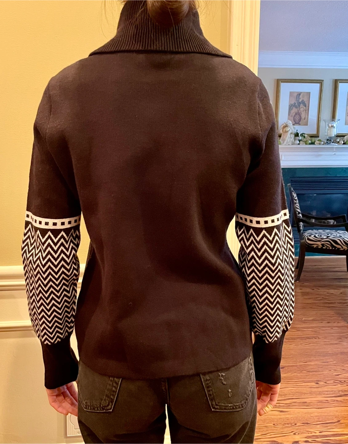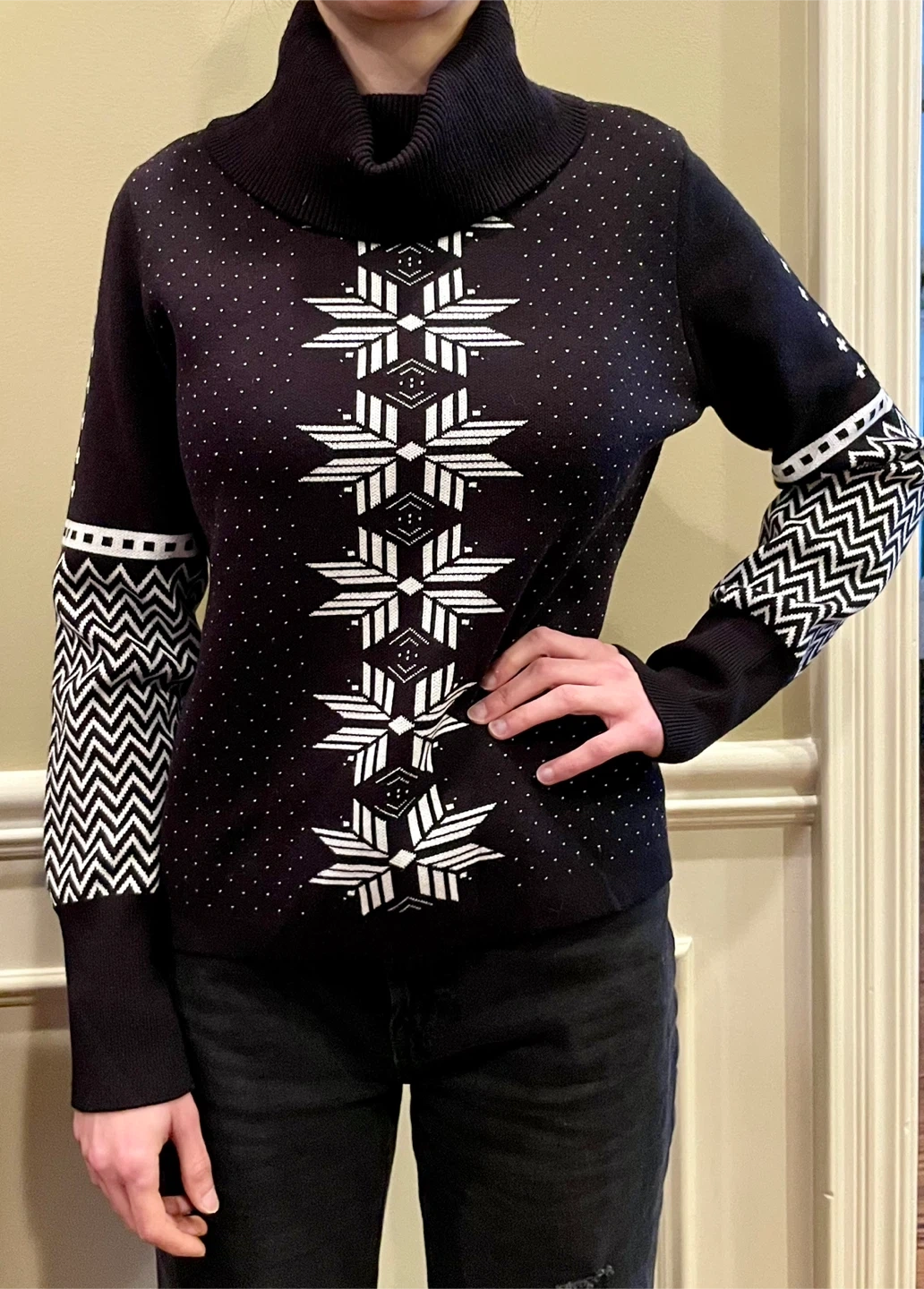Cozy up in this women's black and white turtleneck sweater. It features a festive snowflake and fair isle pattern on the front and sleeves. The ribbed collar, cuffs, and hem add extra warmth.