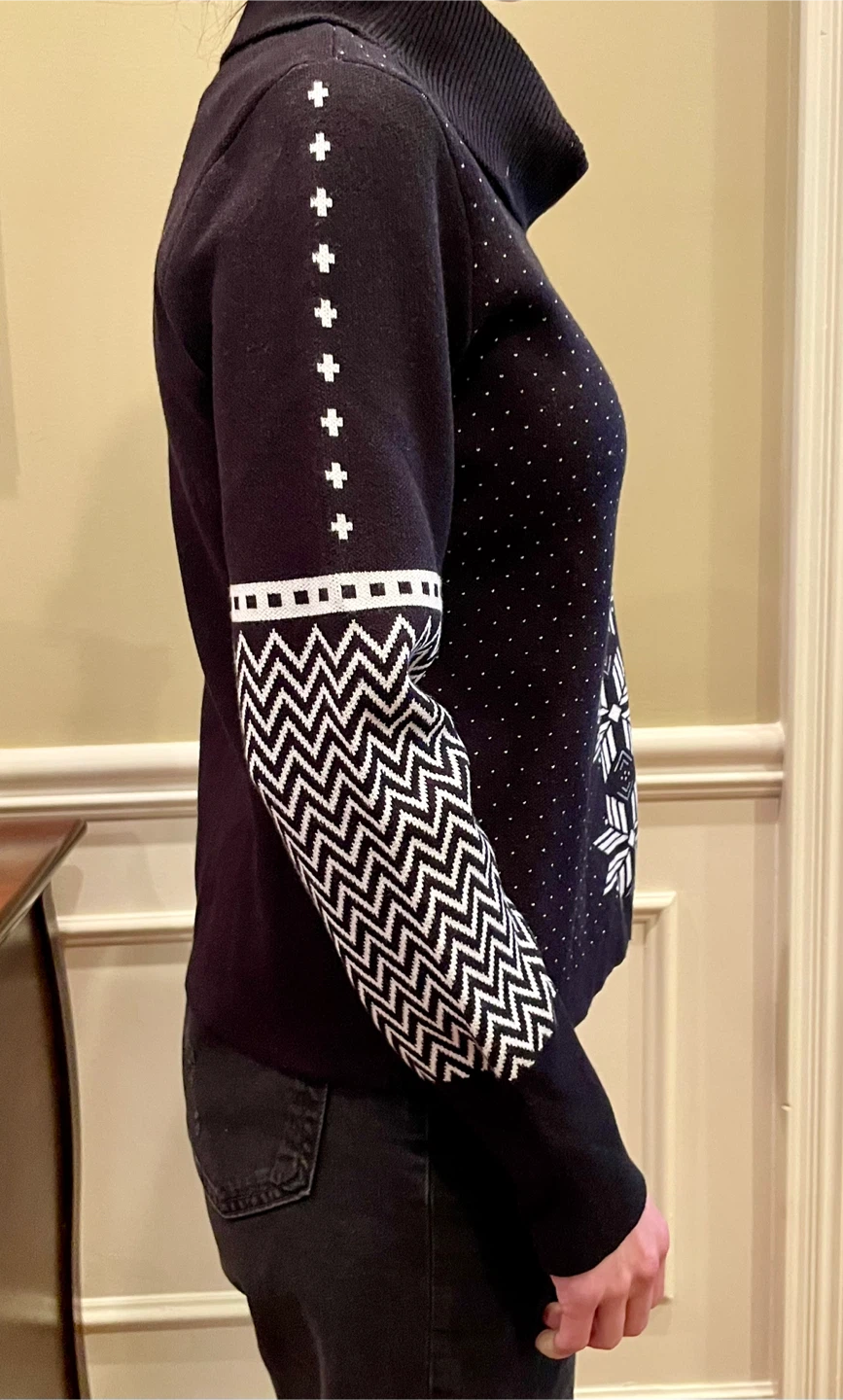 Cozy up in this women's black and white turtleneck sweater. It features a festive snowflake and fair isle pattern on the front and sleeves. The ribbed collar, cuffs, and hem add extra warmth.