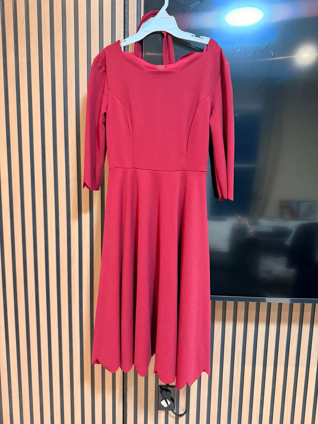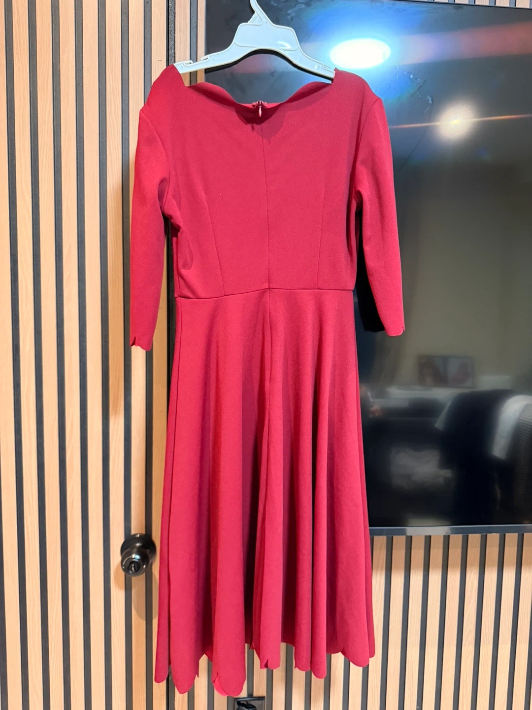 A vibrant red midi dress, perfect for a special occasion. It features a flattering A-line silhouette with a cinched waist and elegant 3/4 sleeves. The scalloped hem adds a playful touch to this classic design. Made from a comfortable, stretchy fabric.