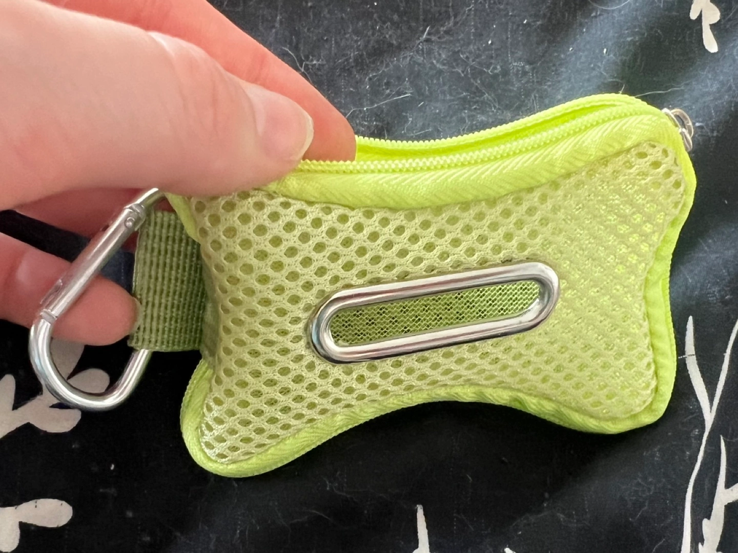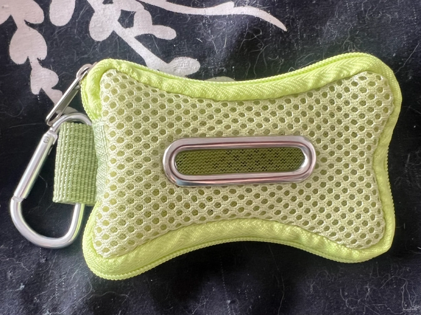Lightweight and portable mesh poop bag dispenser. Bone-shaped design, featuring a carabiner clip. #freecycle