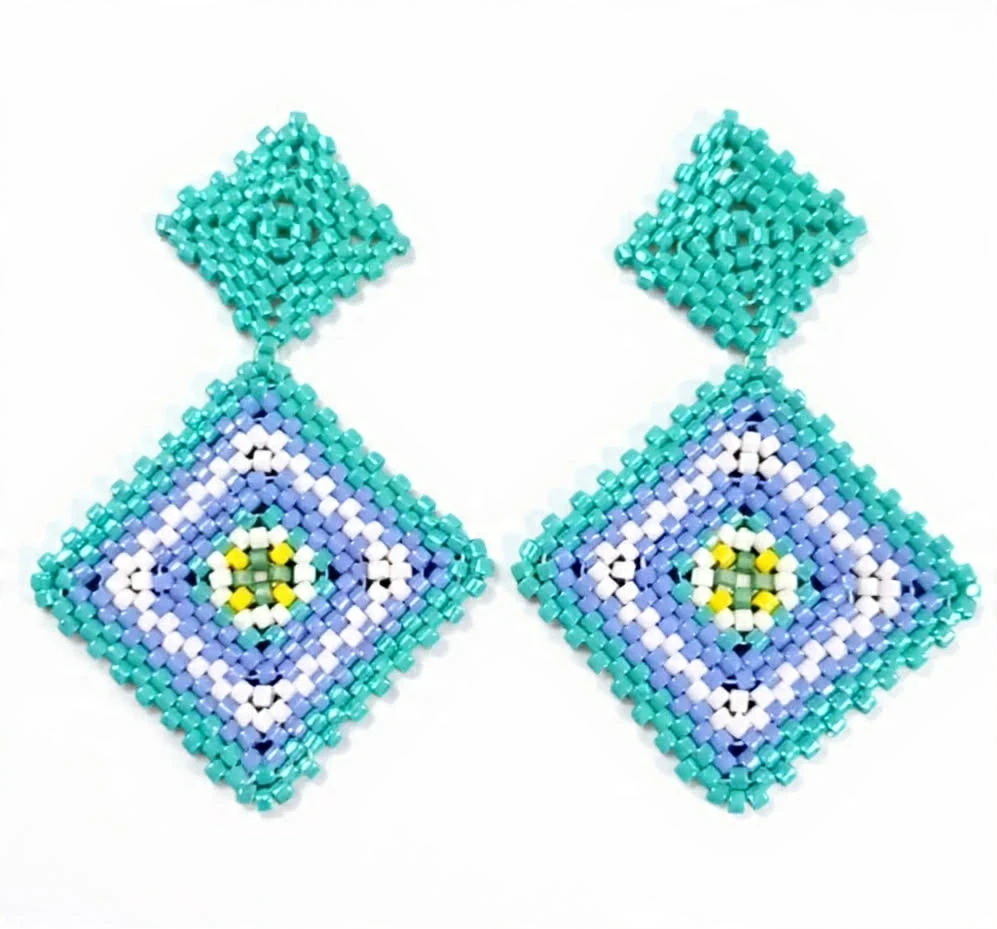These are a pair of handmade beaded earrings. They are turquoise and lavender in color. Perfect for adding a unique touch to any outfit!