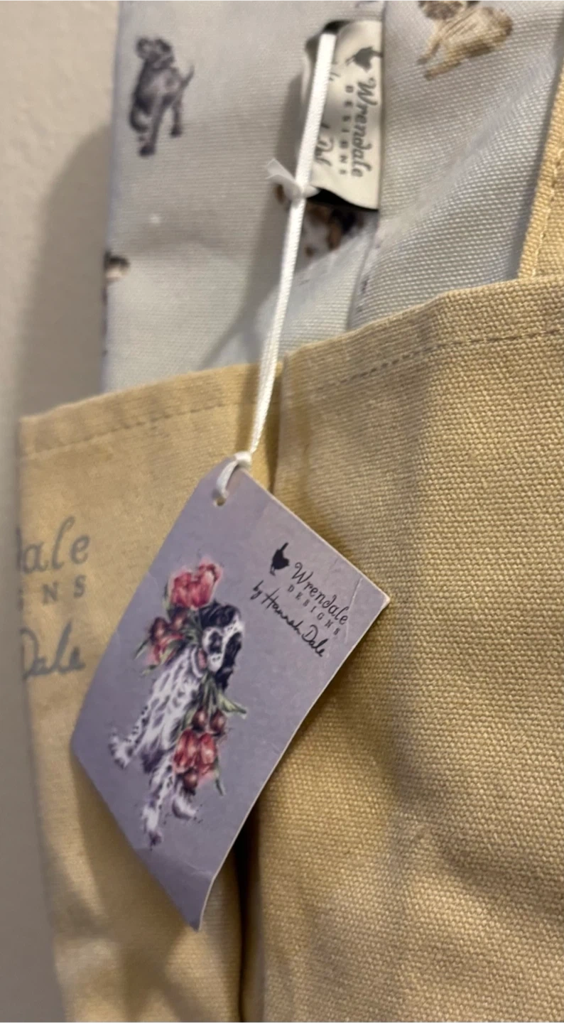 This Wrendale Designs canvas tote bag features a charming print of a dog with flowers, and a repeating dog pattern on the lining. It has an open top with exterior pockets for easy access. Durable canvas material.