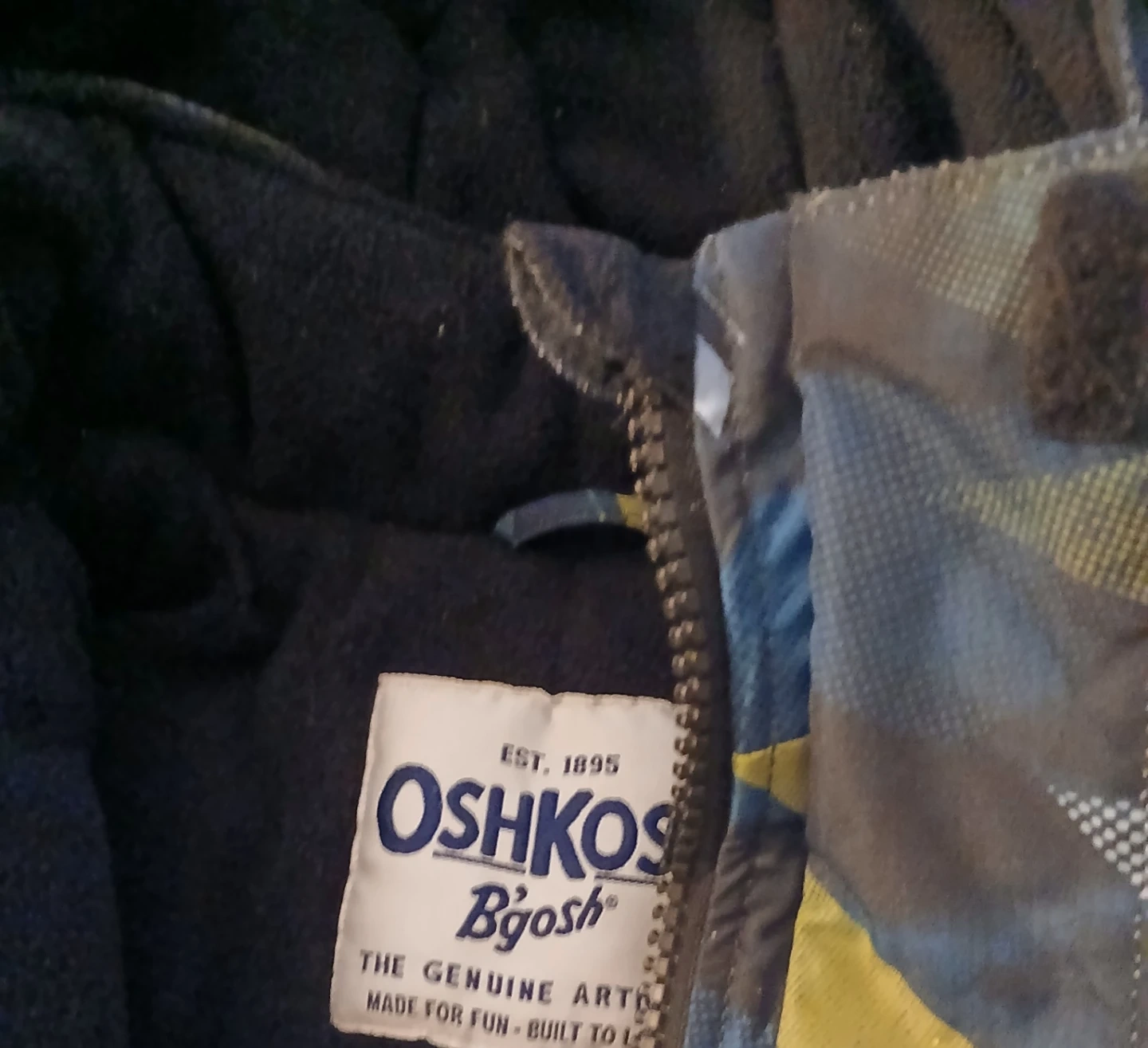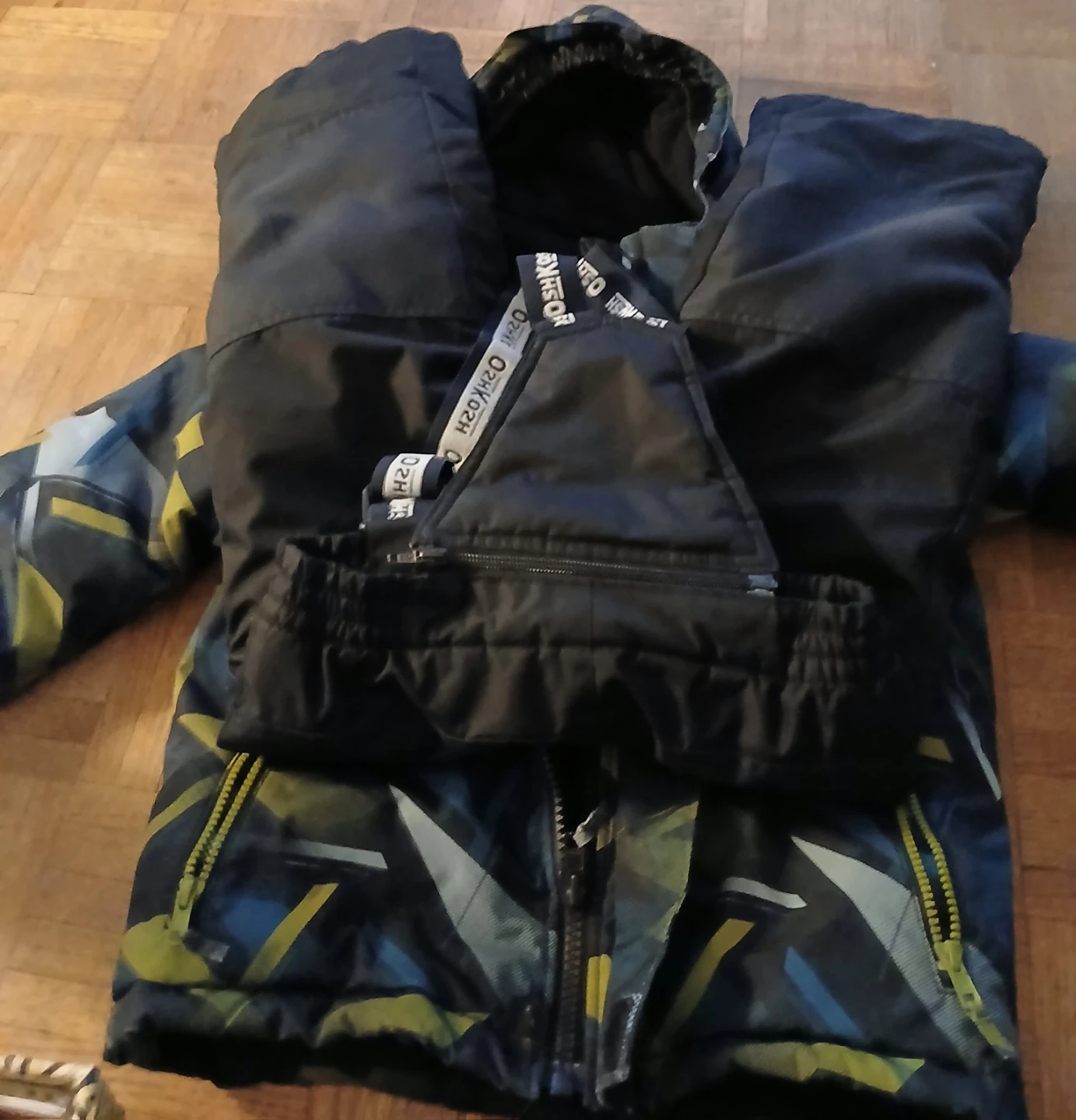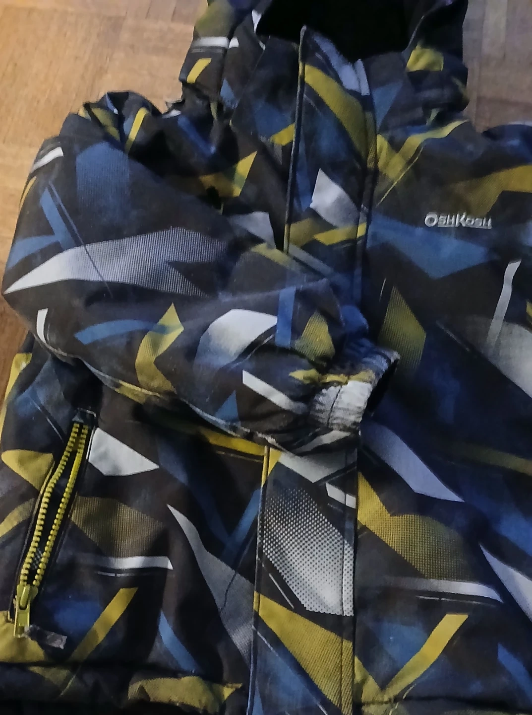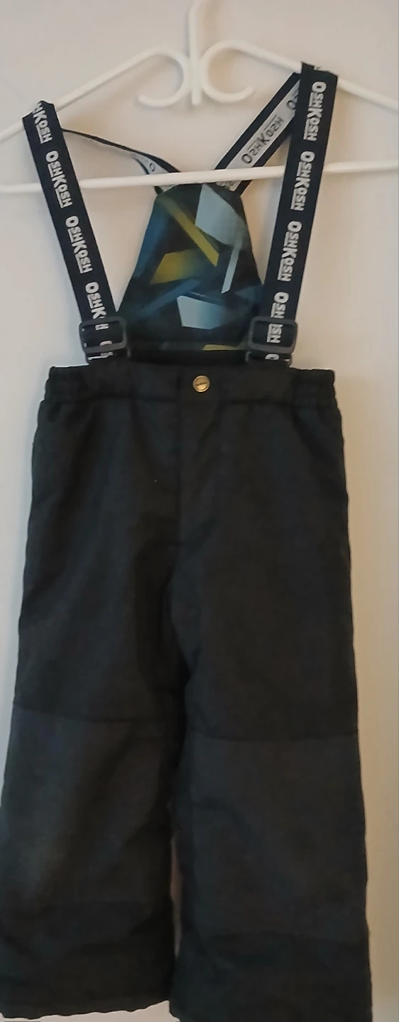 This OshKosh B'gosh set includes a colourful, insulated winter jacket and black snow pants with suspenders. It's designed for keeping kids warm and dry during colder months. The jacket has a patterned exterior with blue, yellow, and grey accents. The pants are black with adjustable suspenders and zippers on the legs.