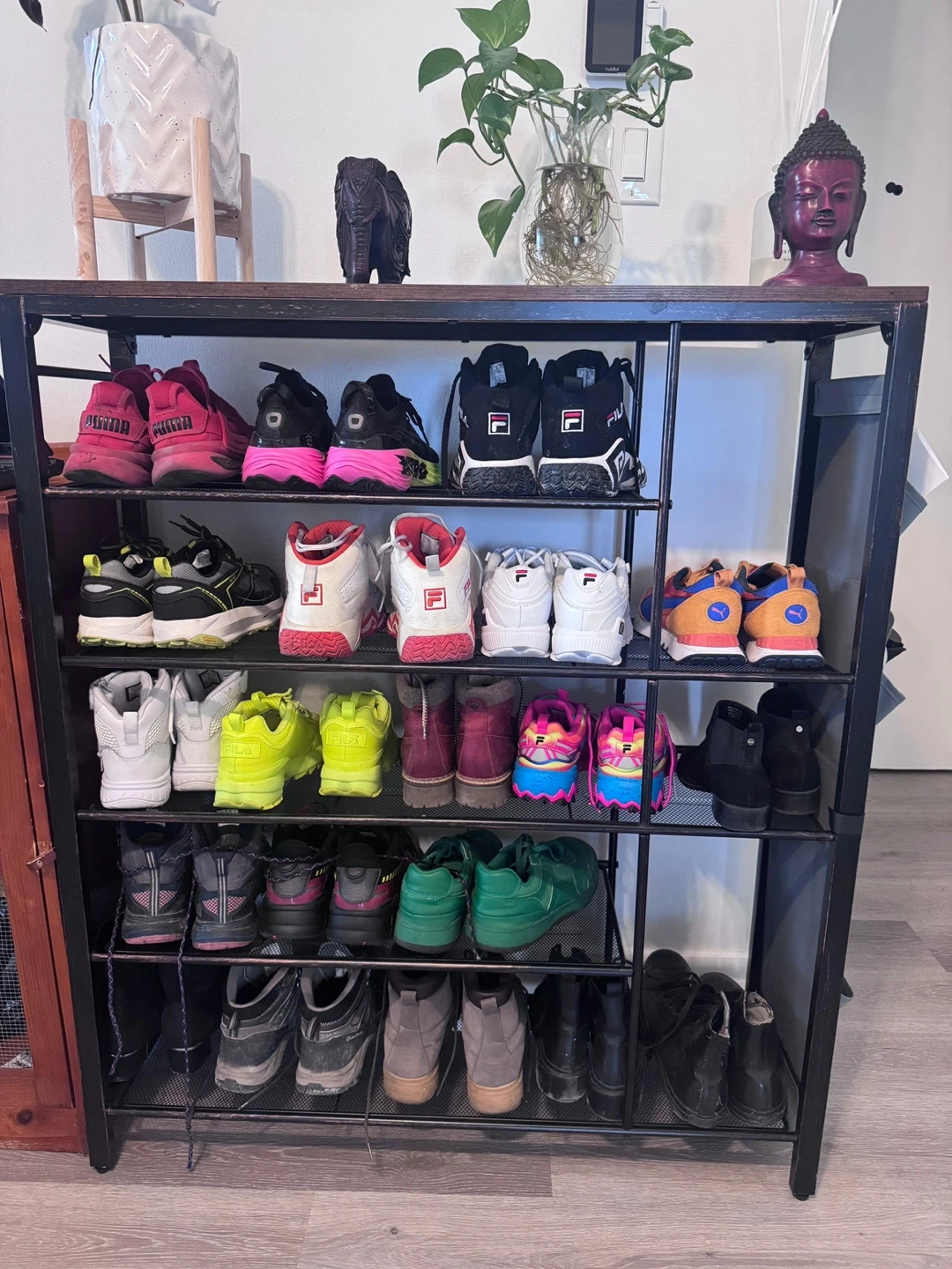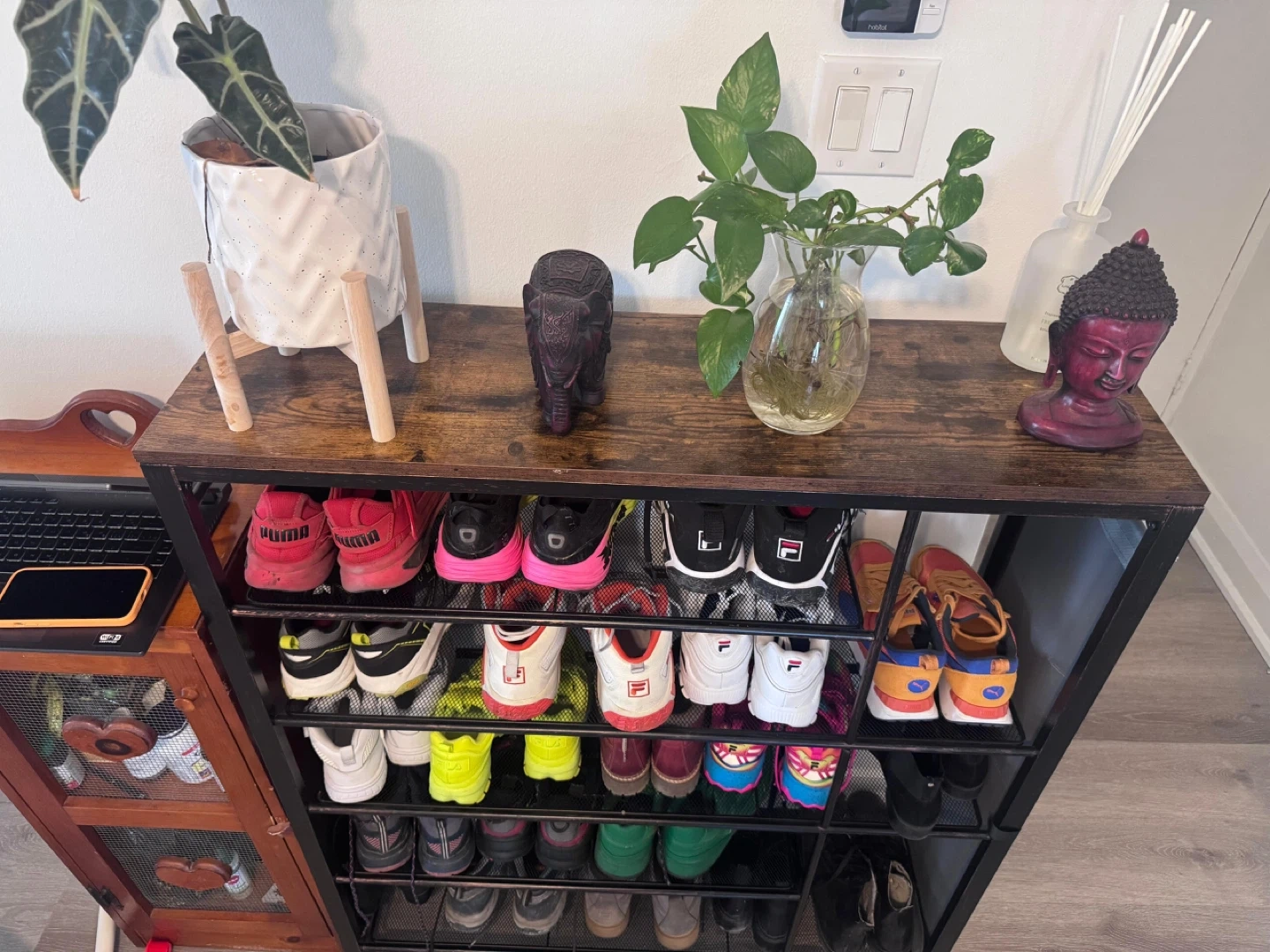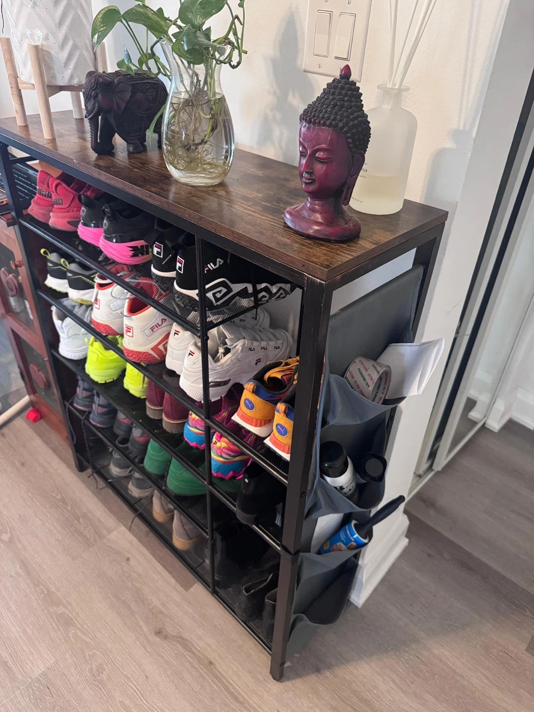This shoe rack has four tiers for ample storage. It features a metal frame with a wooden top shelf. Side pockets offer extra space for accessories. It can stores up to 22 pair of shoes.