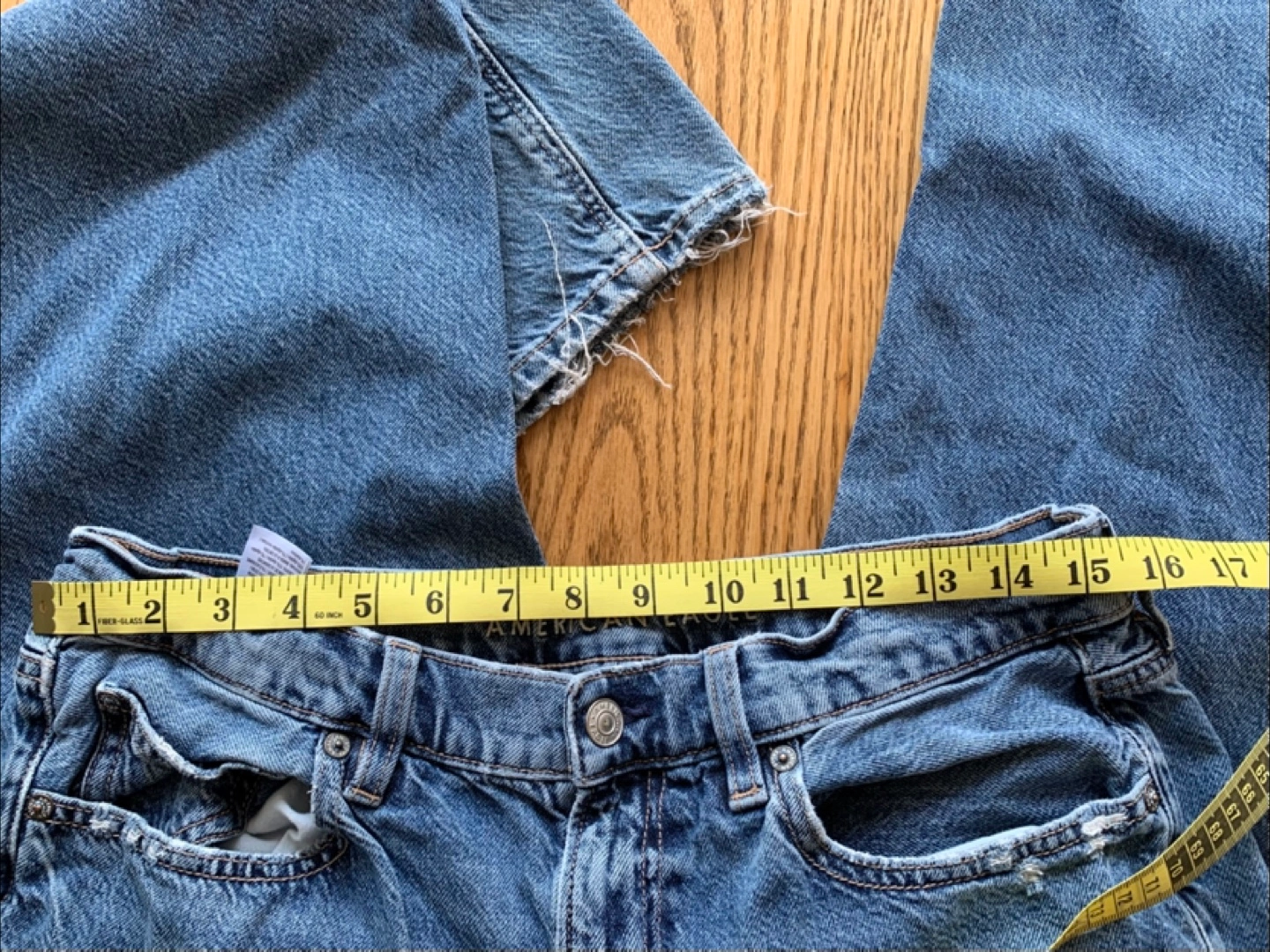 Here are some American Eagle Outfitters jeans in size 12. The waist measures about 31 inches. They're made of 93% cotton and 7% recycled cotton, so they're comfy and durable!