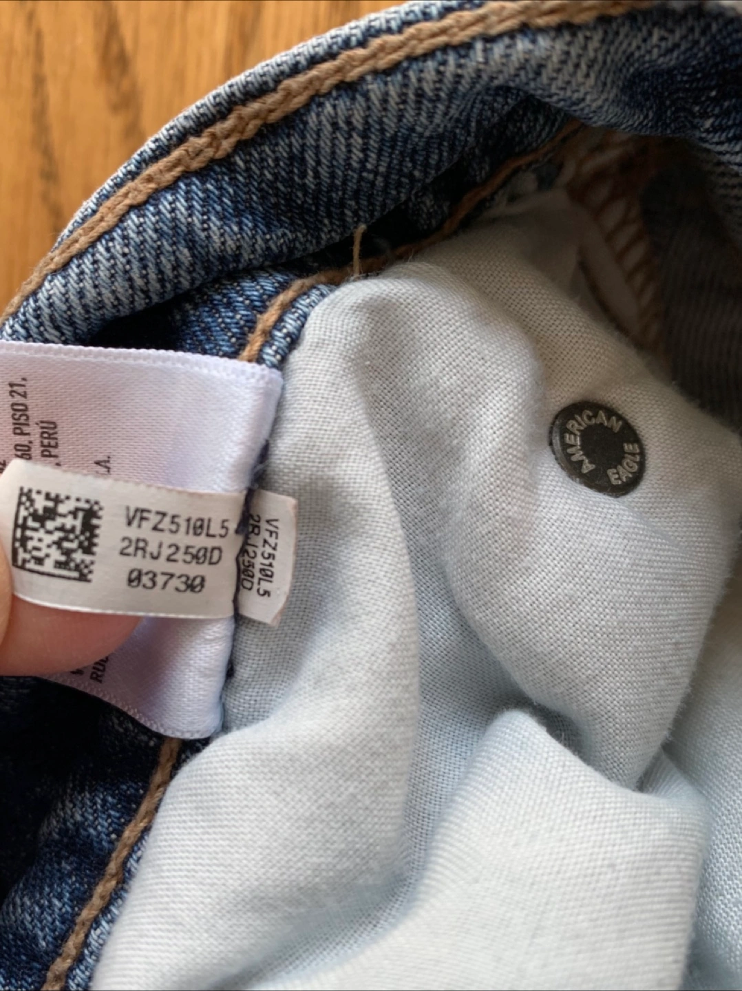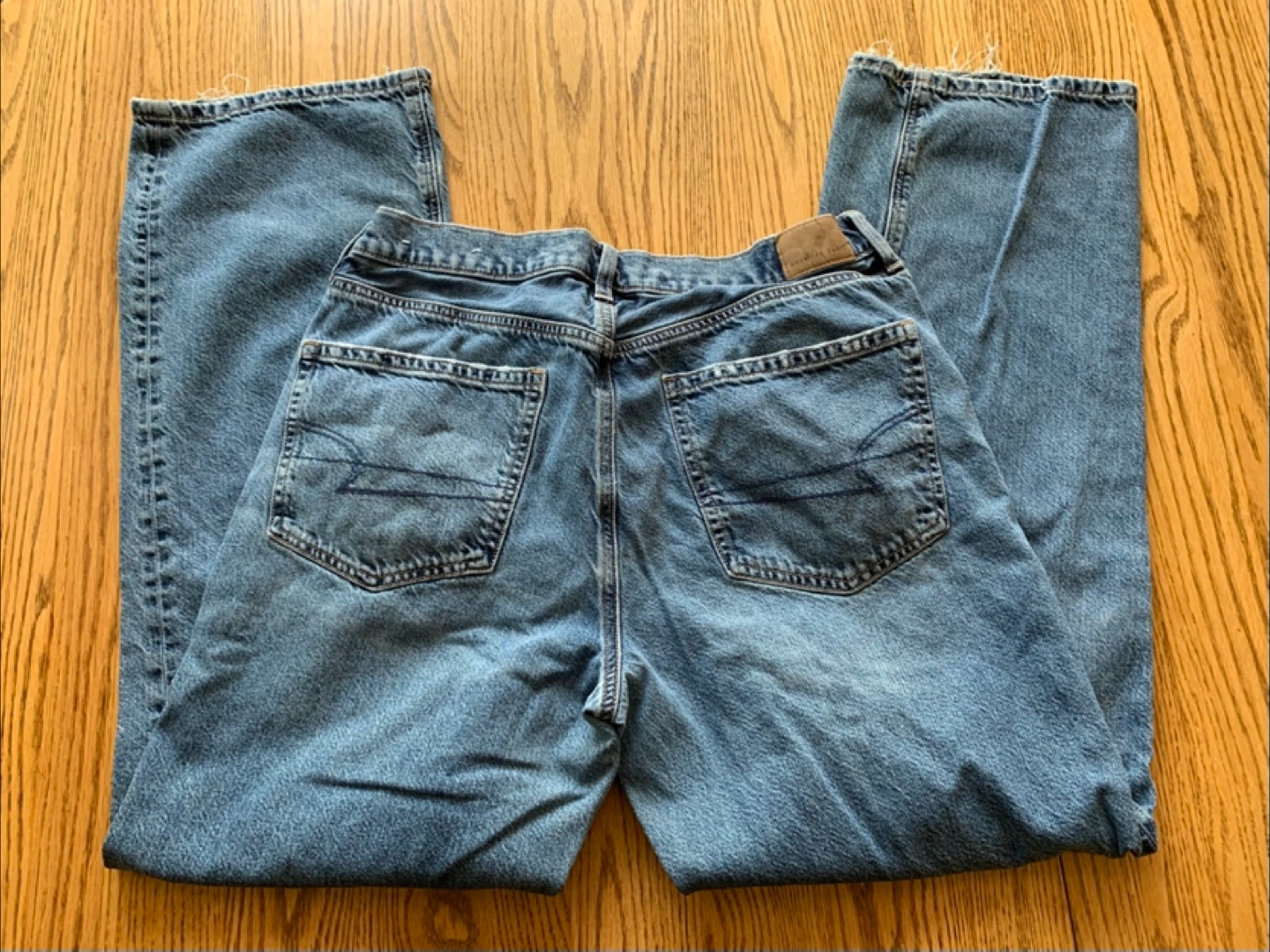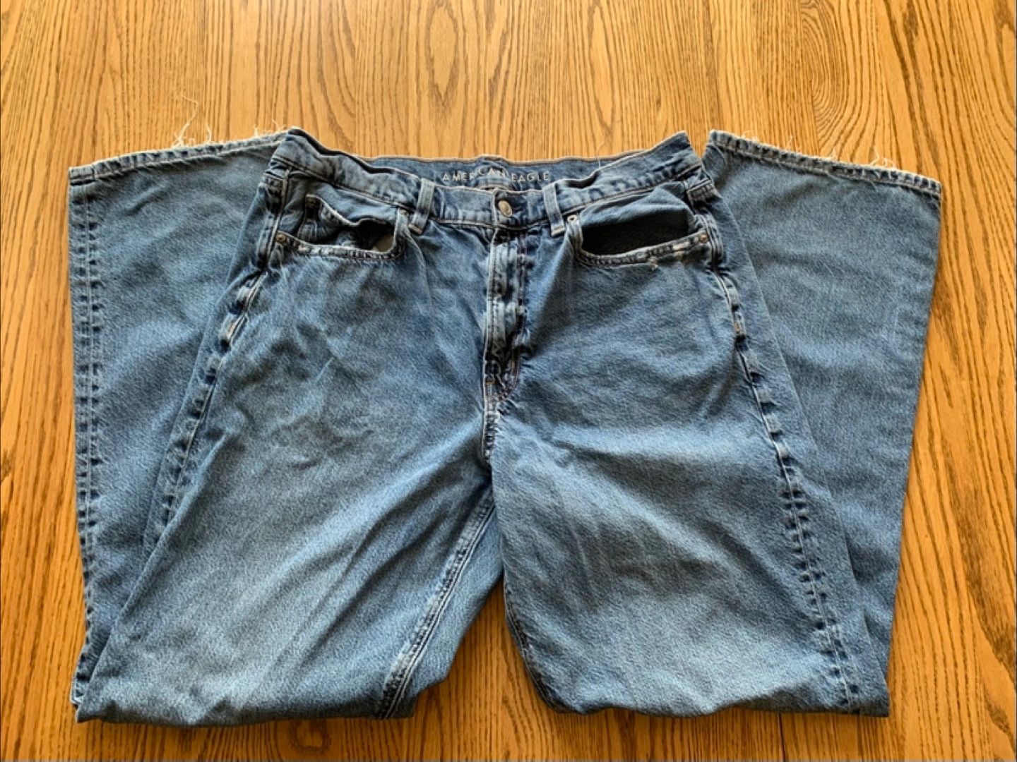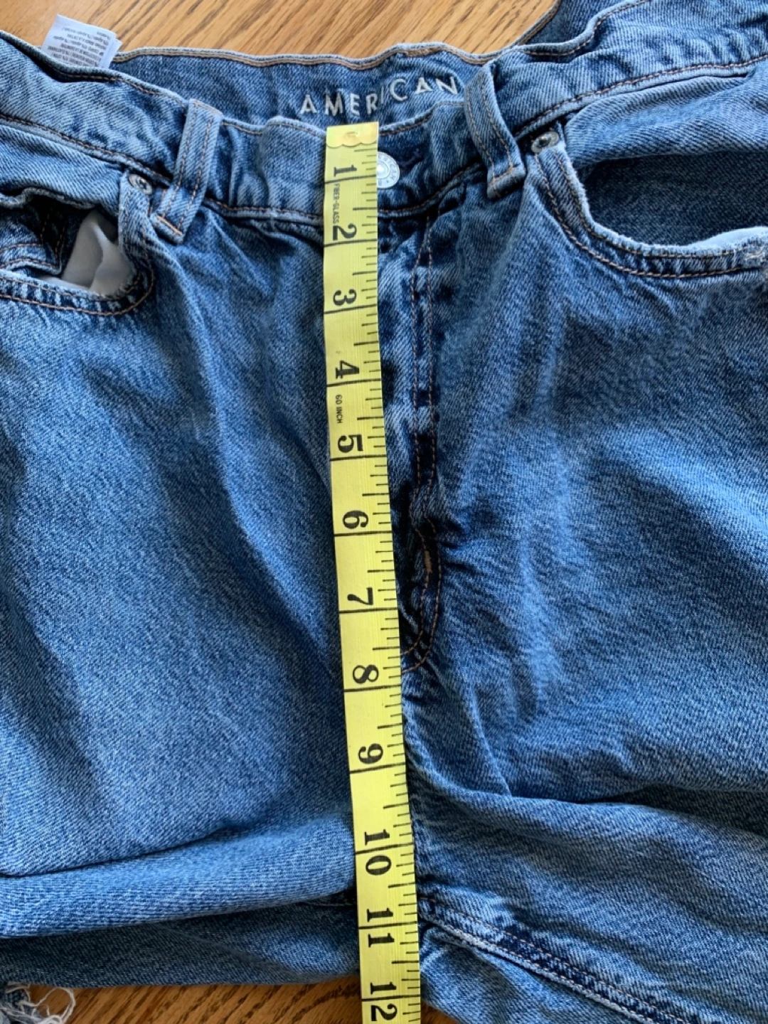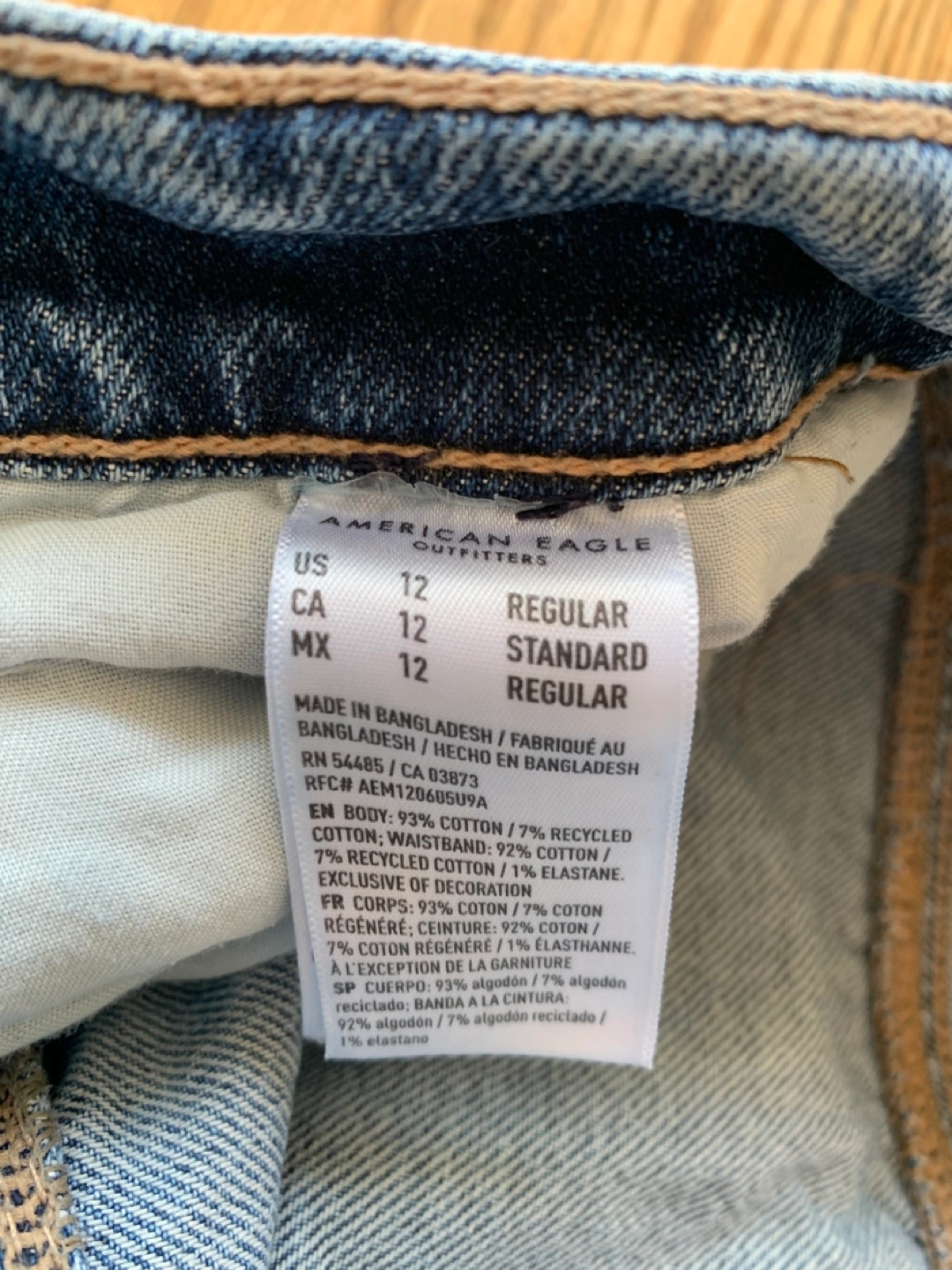 Here are some American Eagle Outfitters jeans in size 12. The waist measures about 31 inches. They're made of 93% cotton and 7% recycled cotton, so they're comfy and durable!