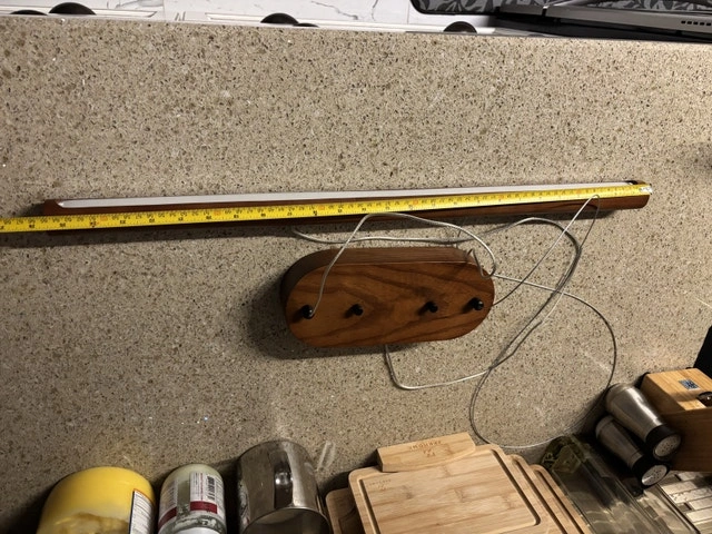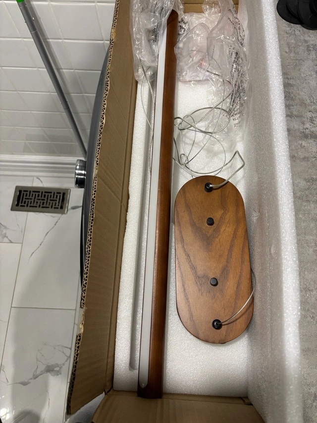 Illuminate your space with this new Wood Integrated LED Linear Pendant Light, featuring walnut color ash wood for a sleek and modern aesthetic. The item is brand new, still in its original packaging, ensuring pristine condition and untouched quality. Specifications: * Type: Integrated LED Pendant Light * Material: Walnut Color Ash Wood * Condition: New. If the ad is up, it's available! I'm pricing this at $180, a fair price for a brand new lighting fixture.