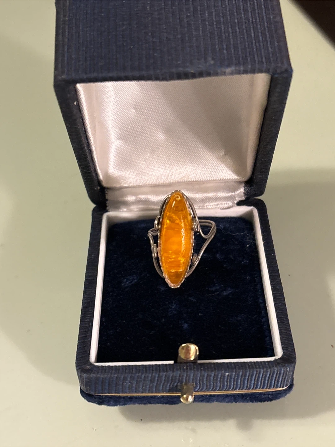 A vintage ring featuring a marquise-cut amber stone set in a decorative Sterling Silver band. It's presented in a navy blue velvet-lined presentation box, perfect for safekeeping or gifting. The ring's intricate setting complements the warm, honey-coloured amber. A lovely piece for special occasions!