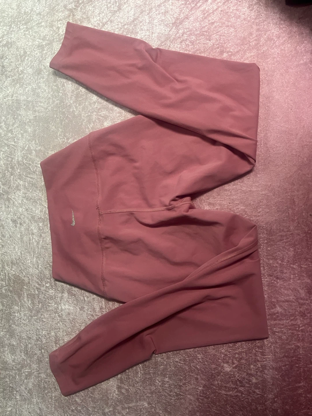 These Nike leggings are a dusty rose colour. Made from a soft, stretchy material, they're designed for comfort during workouts or everyday wear. The waistband sits high for a secure fit.