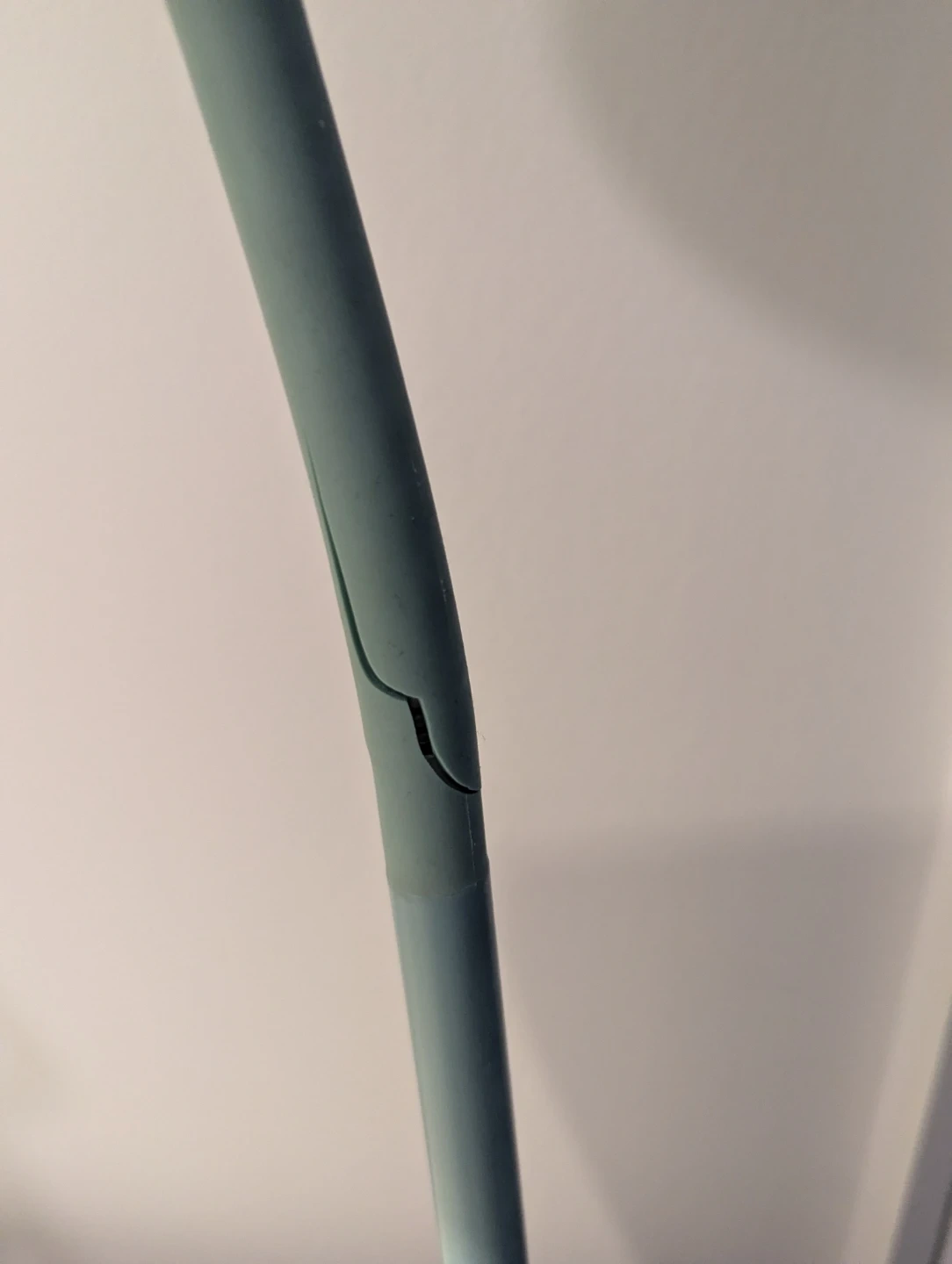 A light blue desk lamp with a conical shade and a flexible neck. It's a great accent for any workspace or bedside table. The flexible neck allows for easy light adjustment. Some minor cosmetic cracks are visible on the neck but don't affect function.