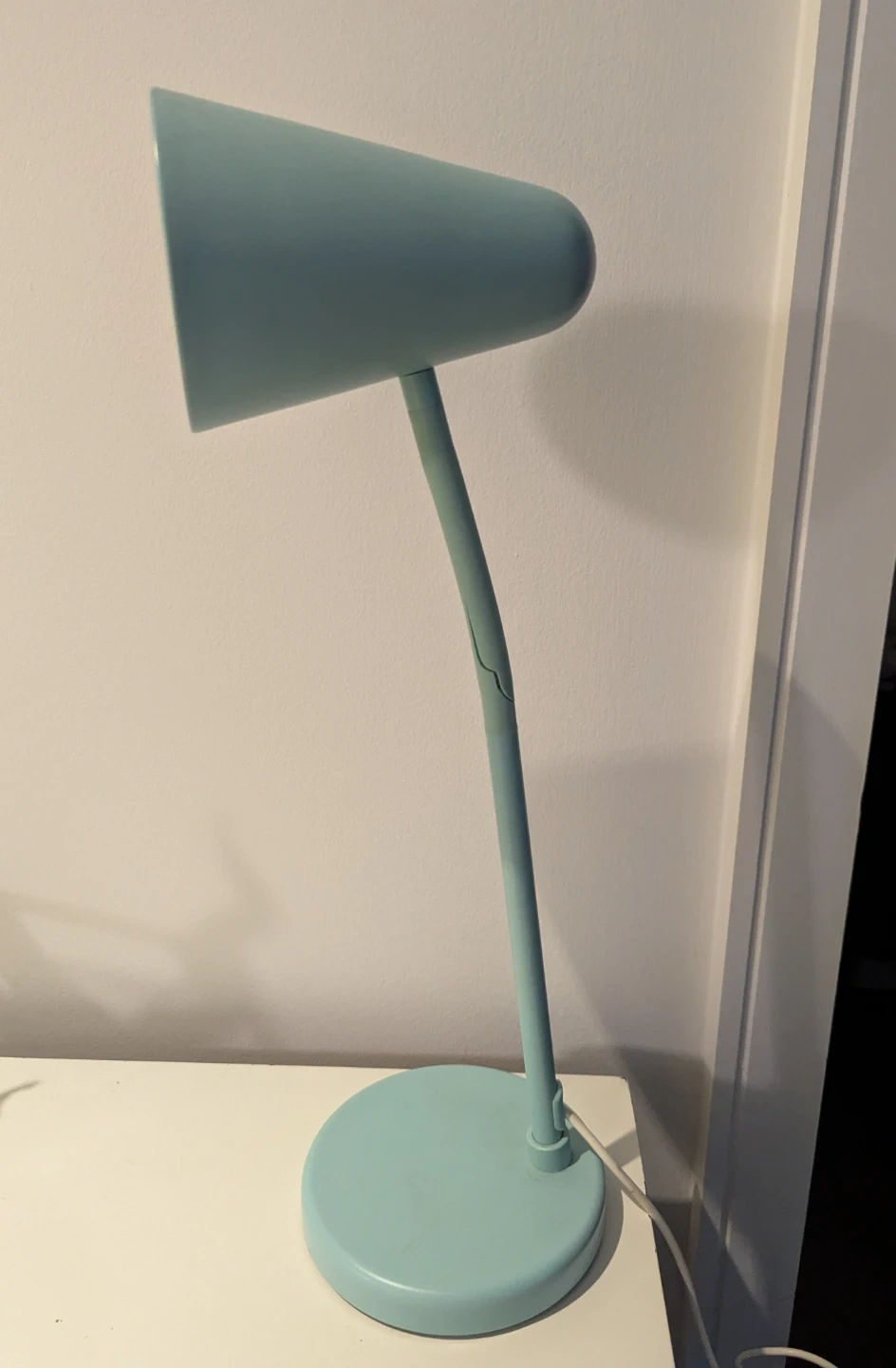 A light blue desk lamp with a conical shade and a flexible neck. It's a great accent for any workspace or bedside table. The flexible neck allows for easy light adjustment. Some minor cosmetic cracks are visible on the neck but don't affect function.