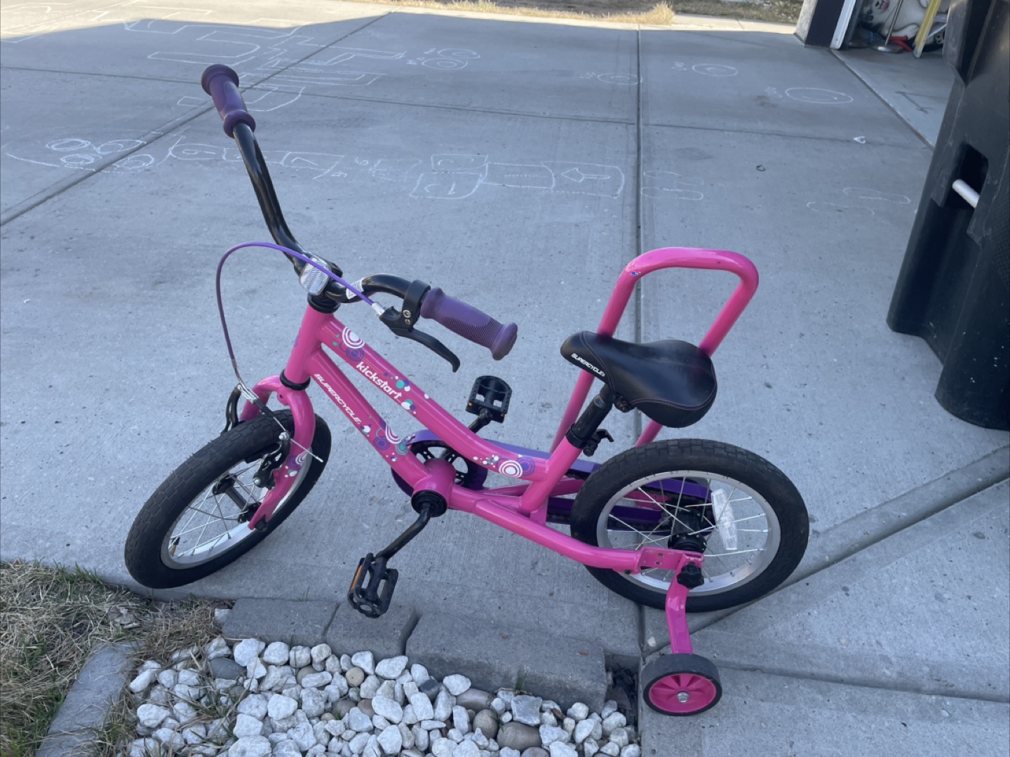 Pink children's bicycle. 14-inch wheels. Includes training wheels. Great for young riders. Will last a while with detachable training wheels and holding bar.