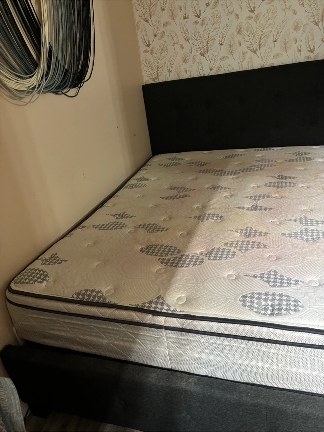 A queen size mattress with a dark grey fabric headboard. It features a patterned mattress top and a quilted white mattress protector. Some yellowing is visible on the mattress, likely from use.