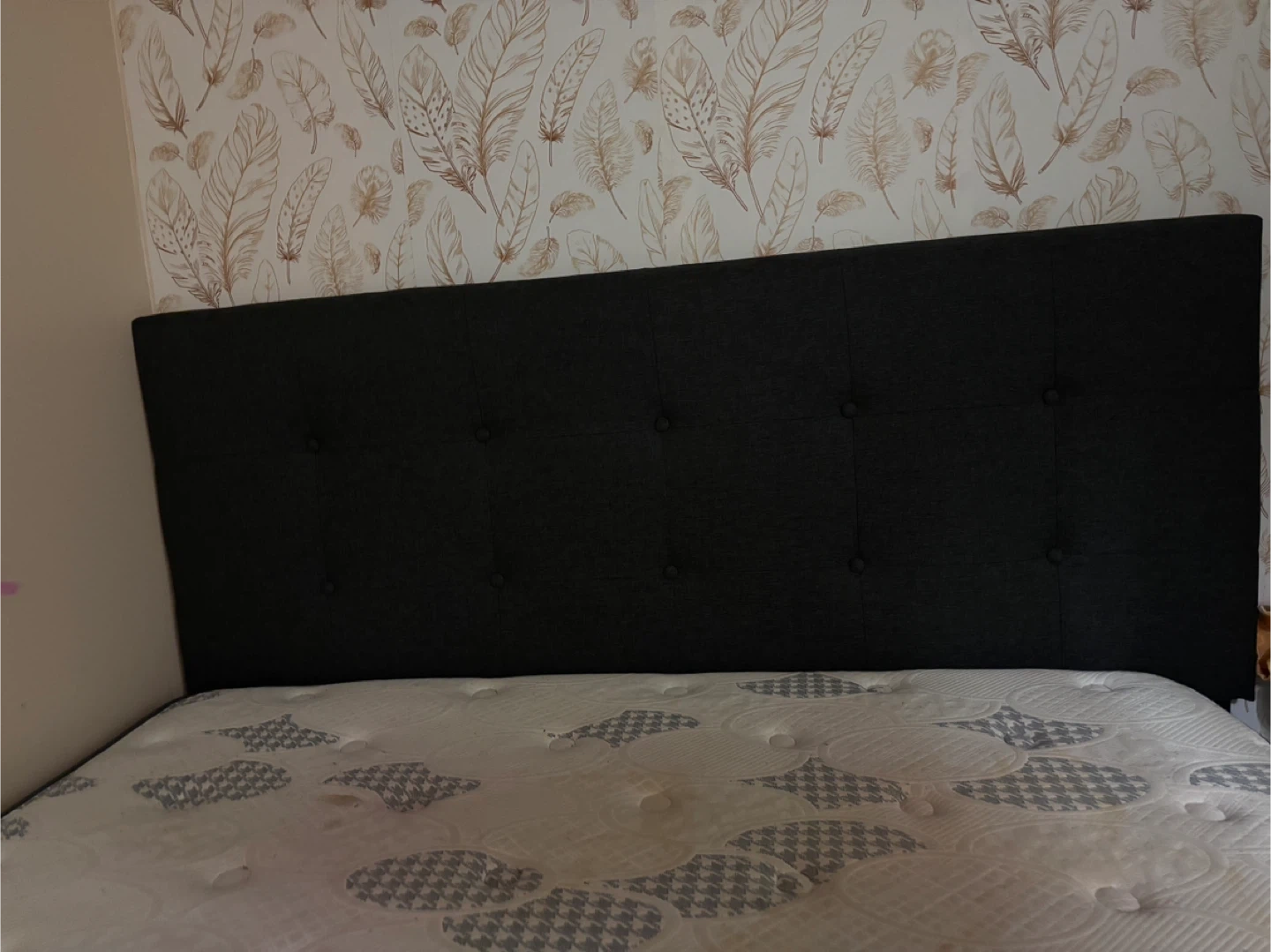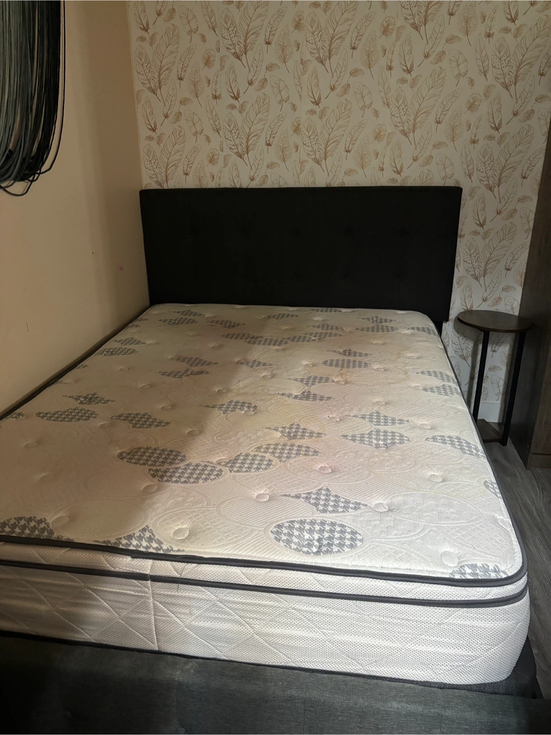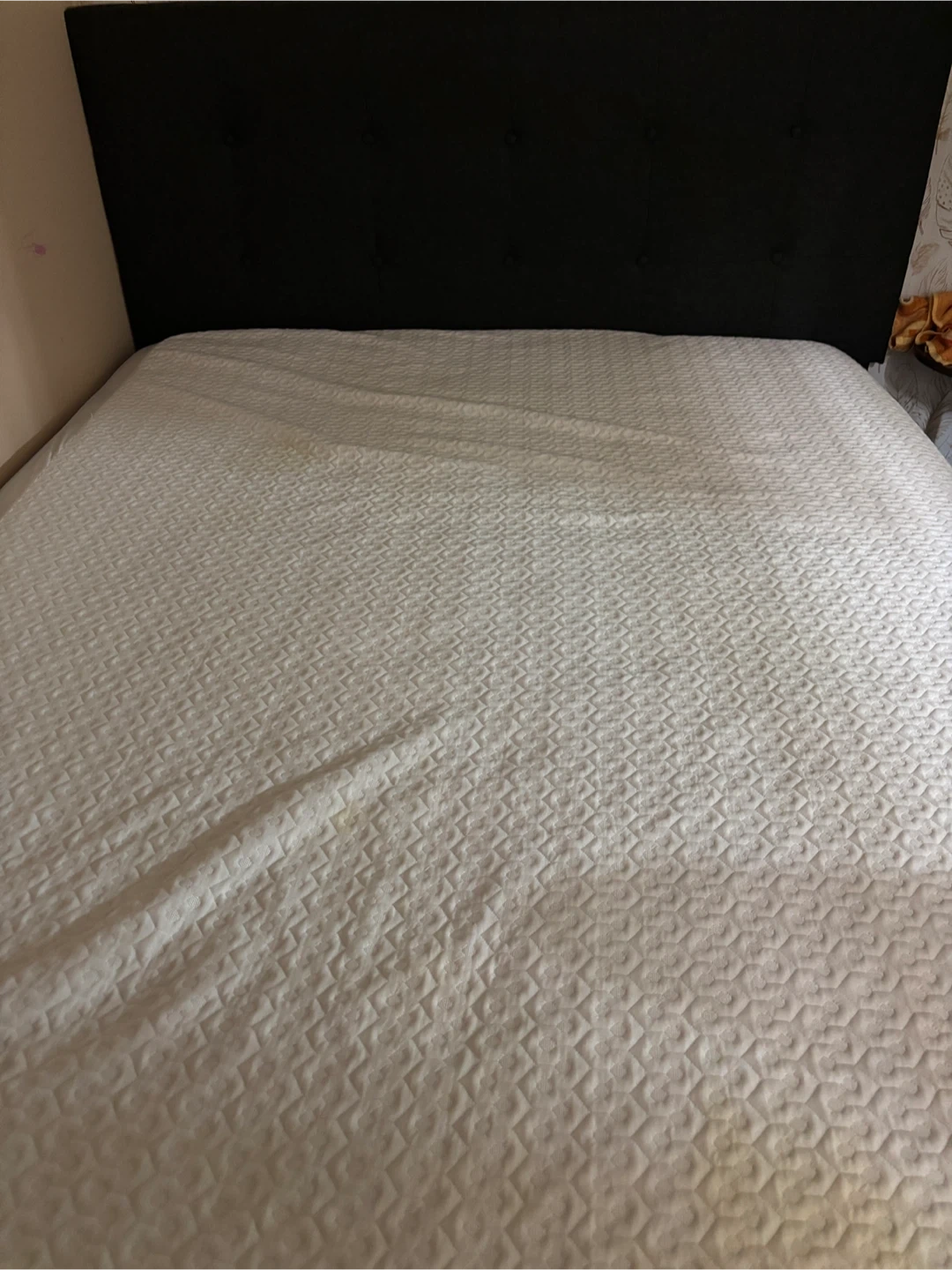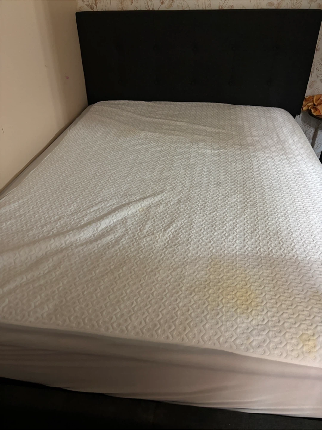 A queen size mattress with a dark grey fabric headboard. It features a patterned mattress top and a quilted white mattress protector. Some yellowing is visible on the mattress, likely from use.