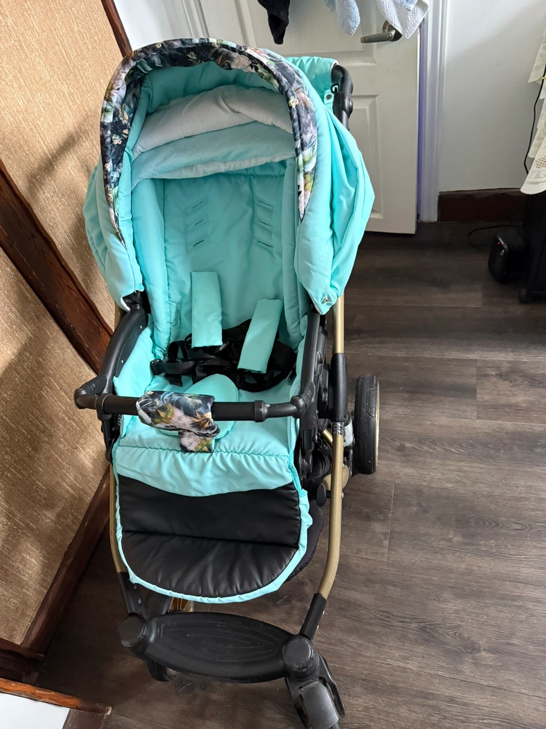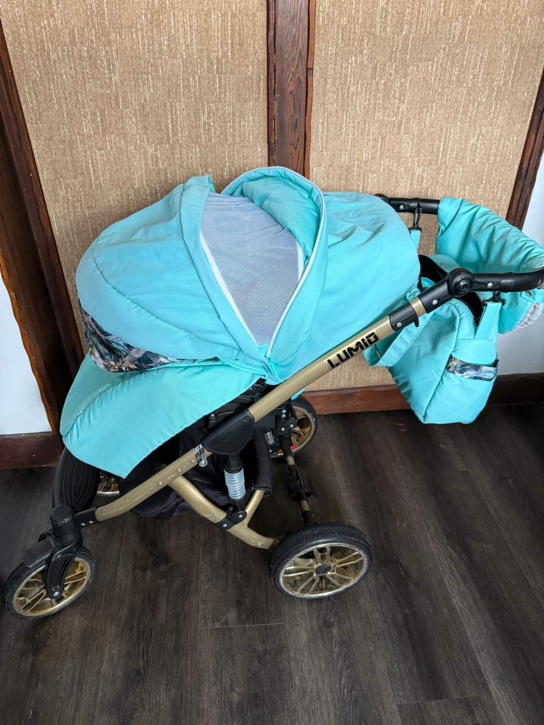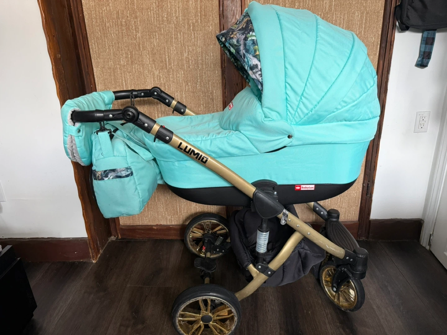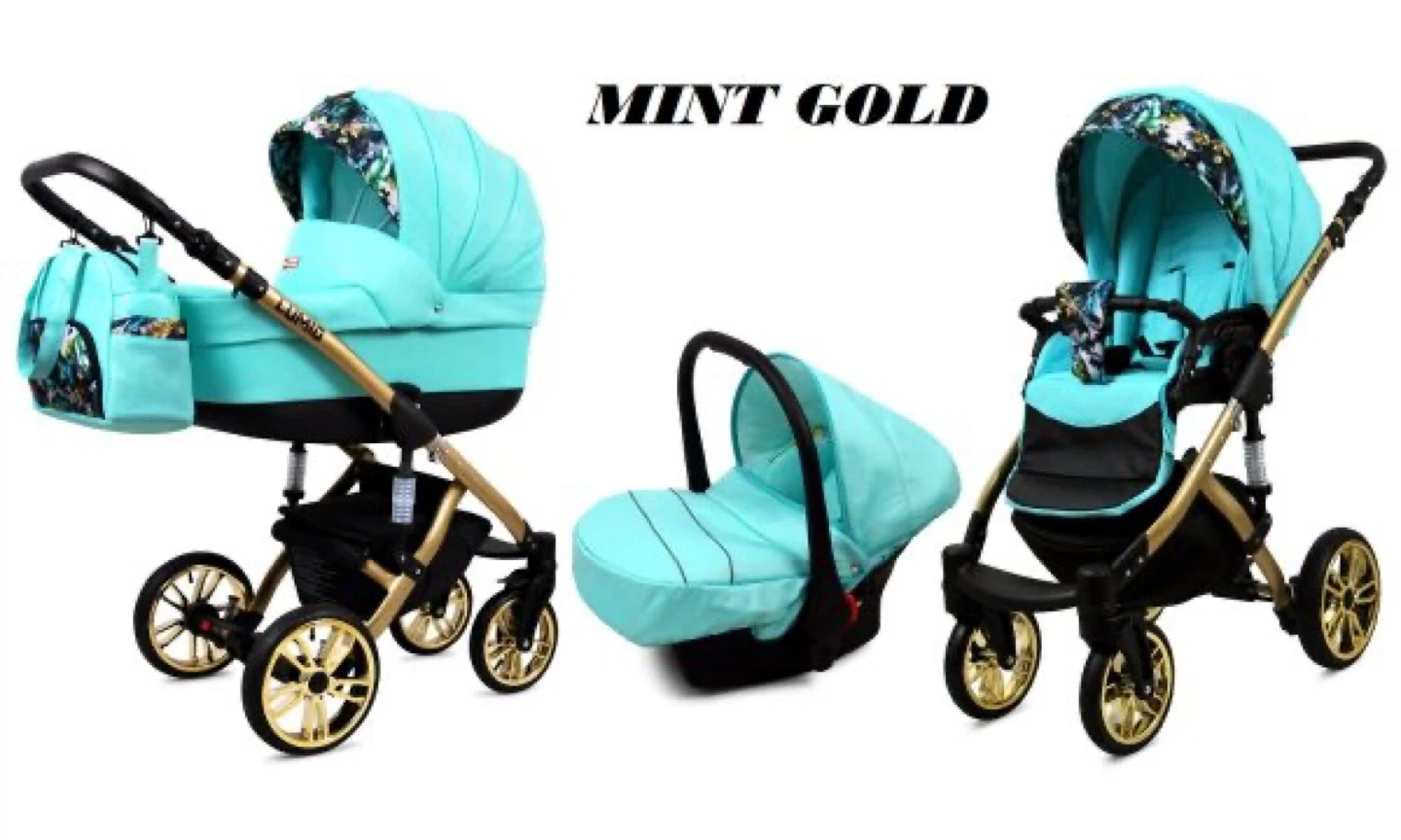 This Lumio baby stroller system comes in a mint and gold colour. It includes a bassinet, a car seat, and a stroller seat, along with a matching diaper bag. The stroller is designed for easy folding and transport.
