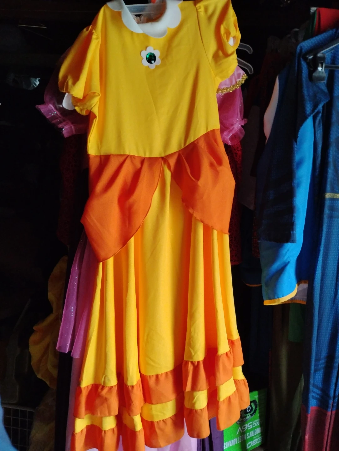 Daisy- Yellow dress with orange accents and ruffled trim. Features a flower detail on the chest. Size L for kids.