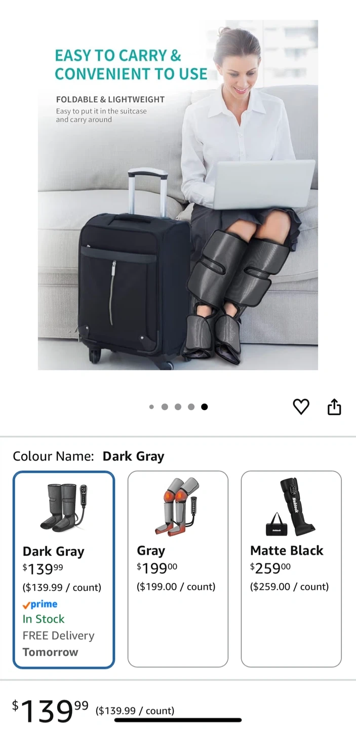 Nekteck air compression leg massager in dark gray. This set includes the leg massager wraps, an adapter, and a user manual. It features 2 massage modes and 3 intensity levels, with a 20-minute auto-off function. It's great for relieving muscle fatigue and improving circulation.