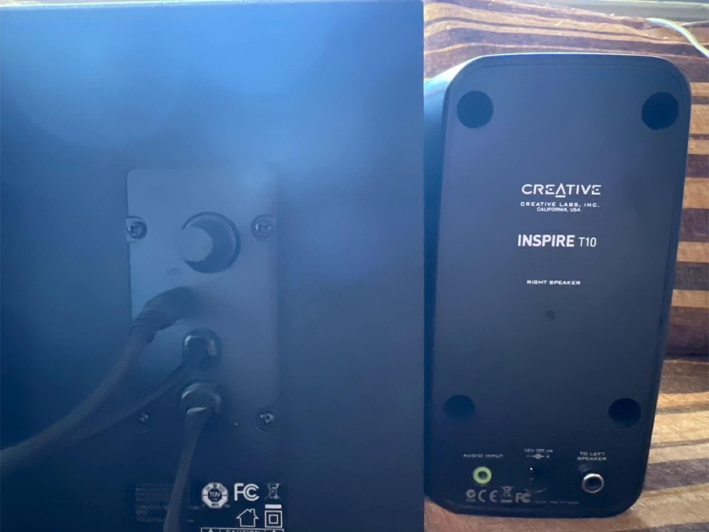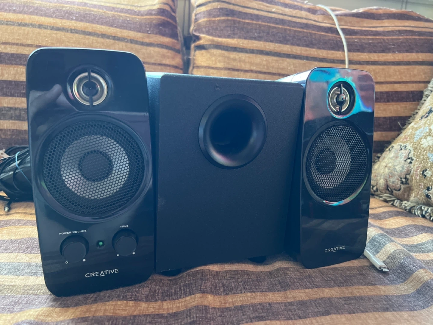 This is a set of Creative Inspire T10 2.0 desktop speakers with a subwoofer. They're black and include the necessary cables and power adapter. This speaker set is great for enhancing your computer's audio experience!