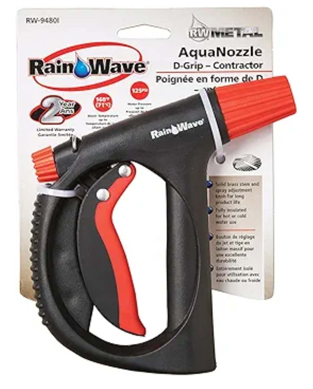 Selling a Rain Wave AquaNozzle with a D-Grip handle! It's a contractor-grade nozzle with a solid brass stem and spray adjustment knob for long product life. It's fully insulated for hot or cold water use.