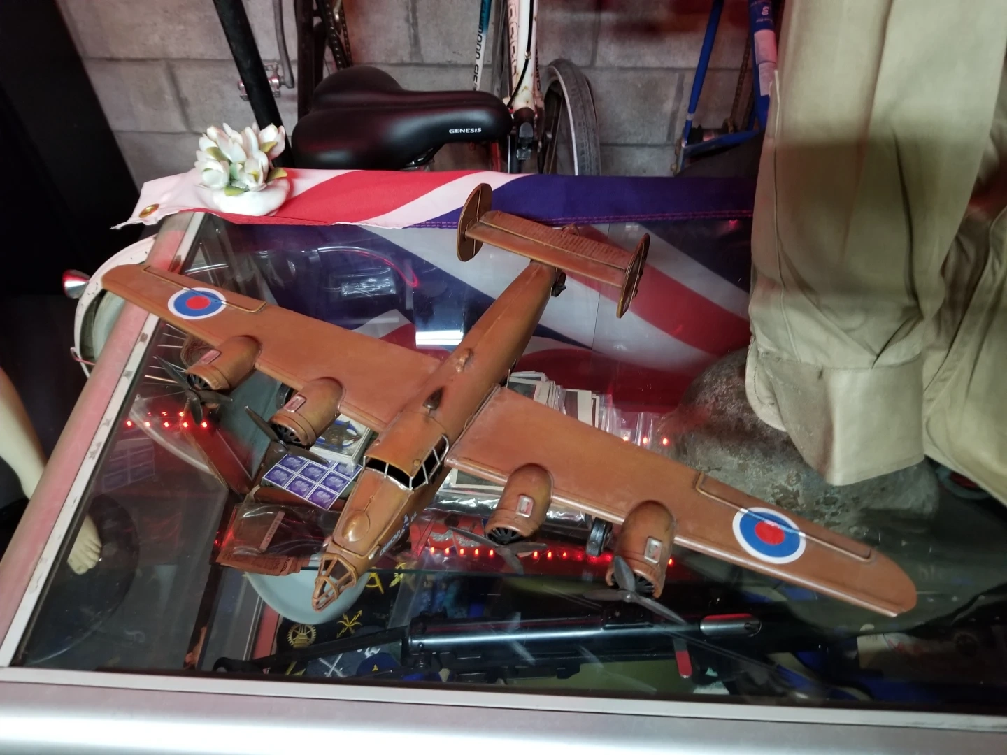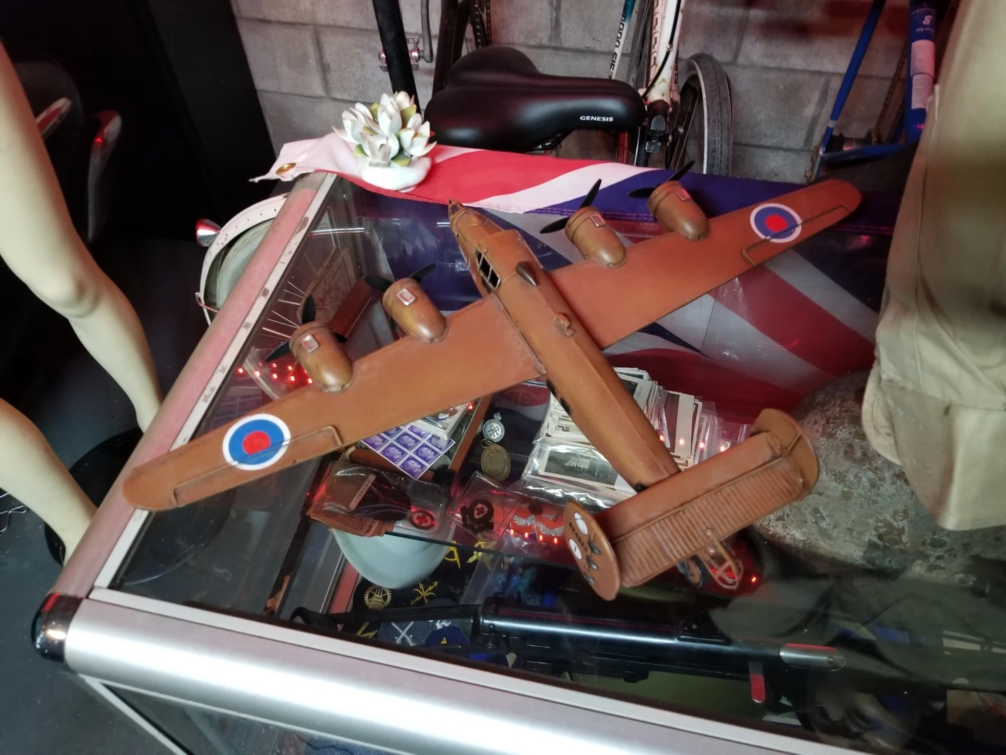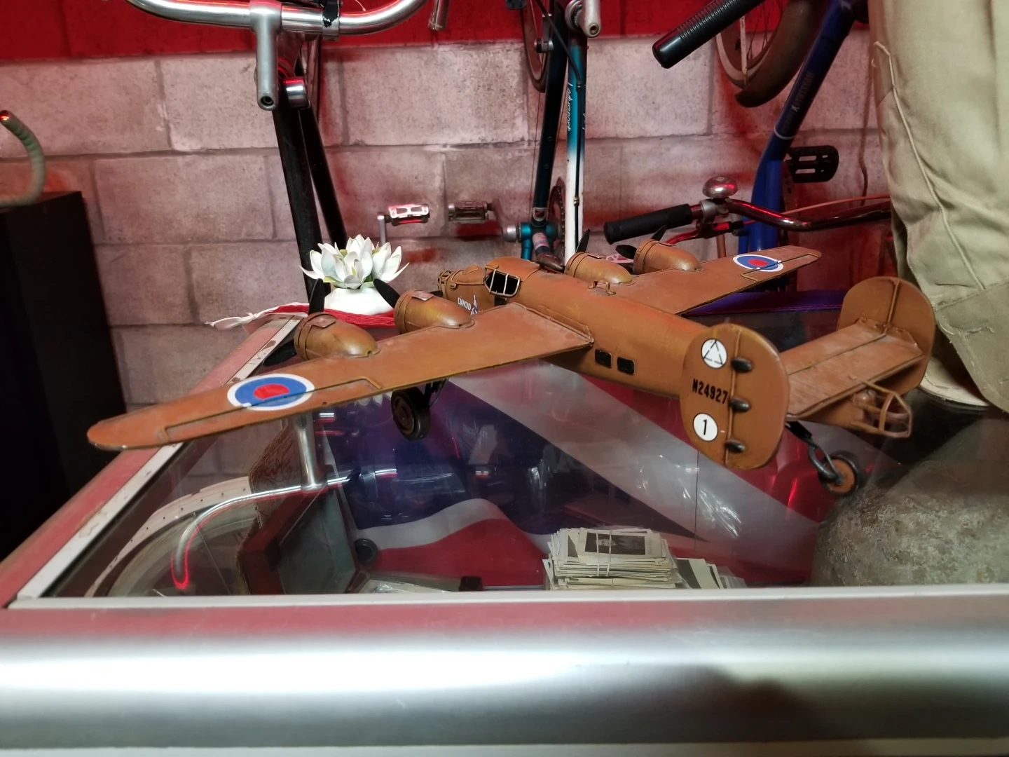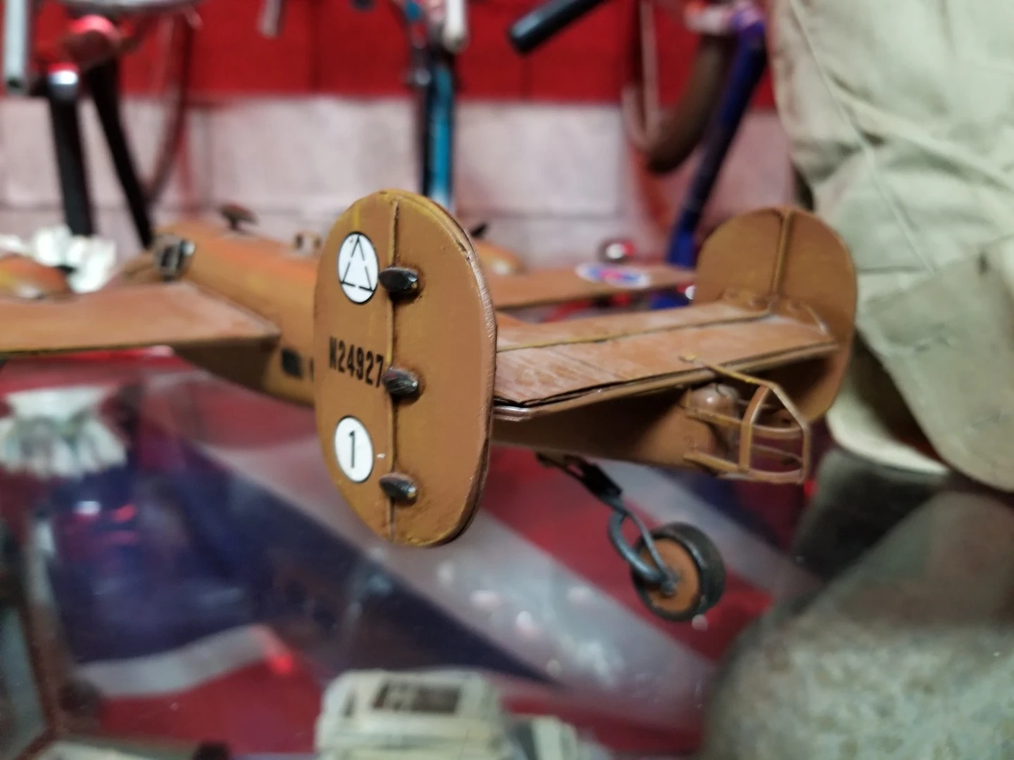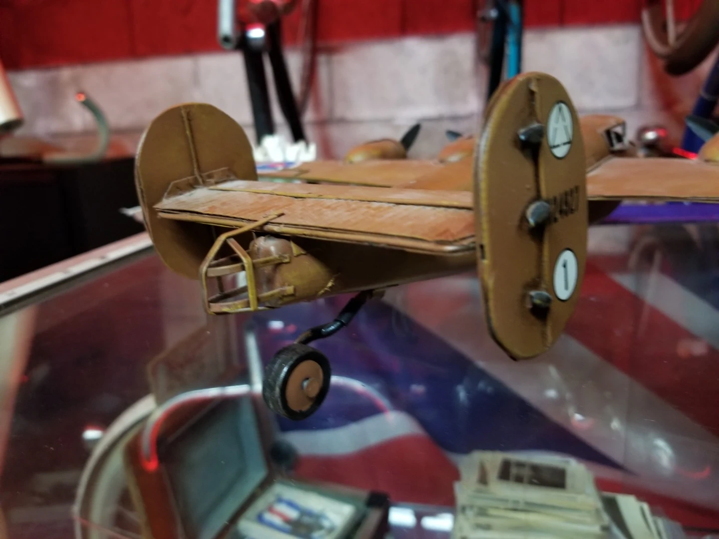 Someone must have applied British roundals on the wings ? Can easily be removed looks like it is just model water slide roundal decals. Measured about 23" wingspan and 13" front to back.