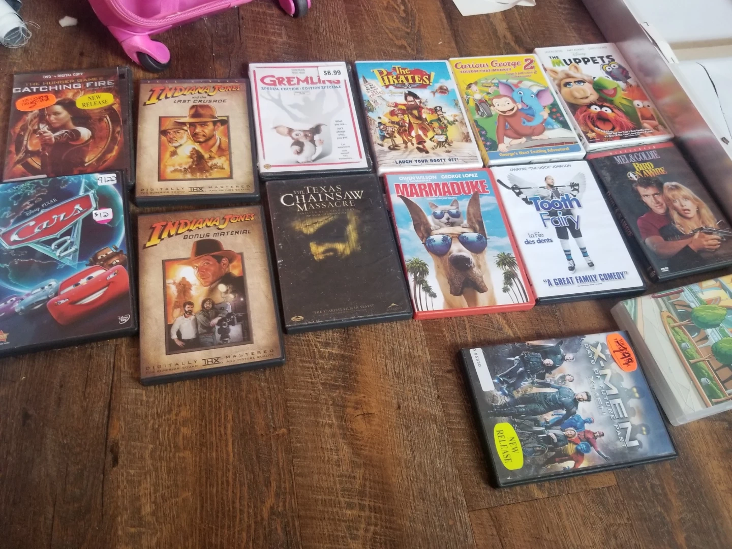 Collection of various DVD movies including Disney Pixar Cars, Indiana Jones, The Gremlins, The Pirates, Current George, The Muppets, Texas Chainsaw Massacre, Marmaduke, and Tooth Fairy. Also includes X-Men, and other assorted titles. Some discs might be scratched but are in playable condition.