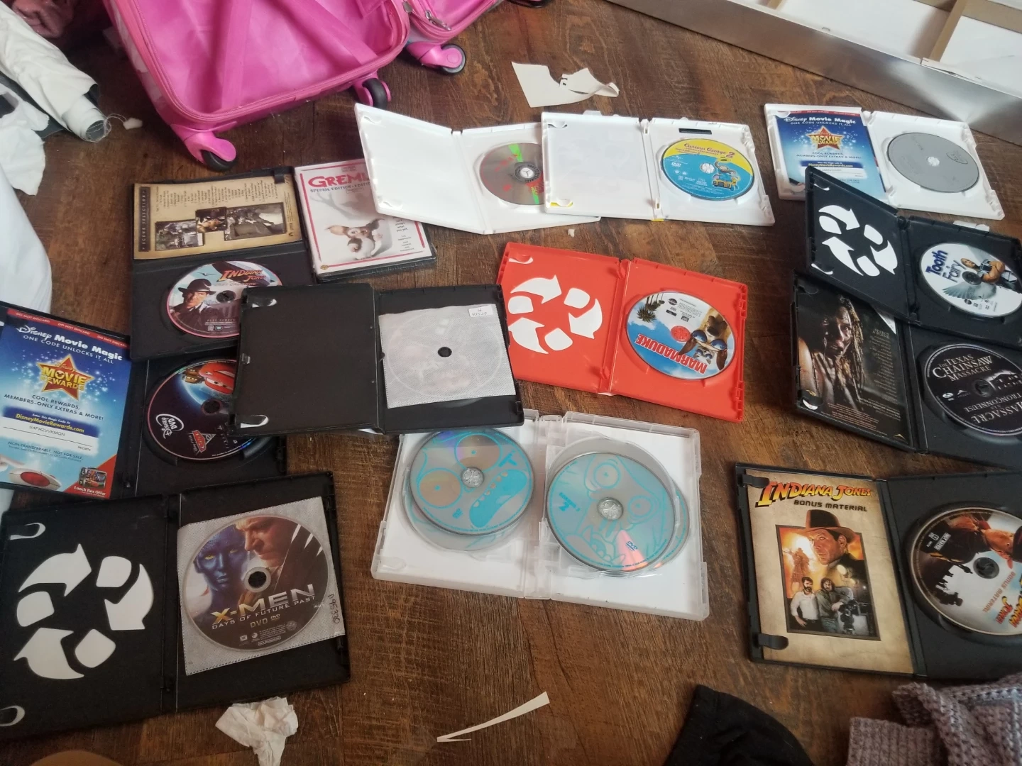 Collection of various DVD movies including Disney Pixar Cars, Indiana Jones, The Gremlins, The Pirates, Current George, The Muppets, Texas Chainsaw Massacre, Marmaduke, and Tooth Fairy. Also includes X-Men, and other assorted titles. Some discs might be scratched but are in playable condition.
