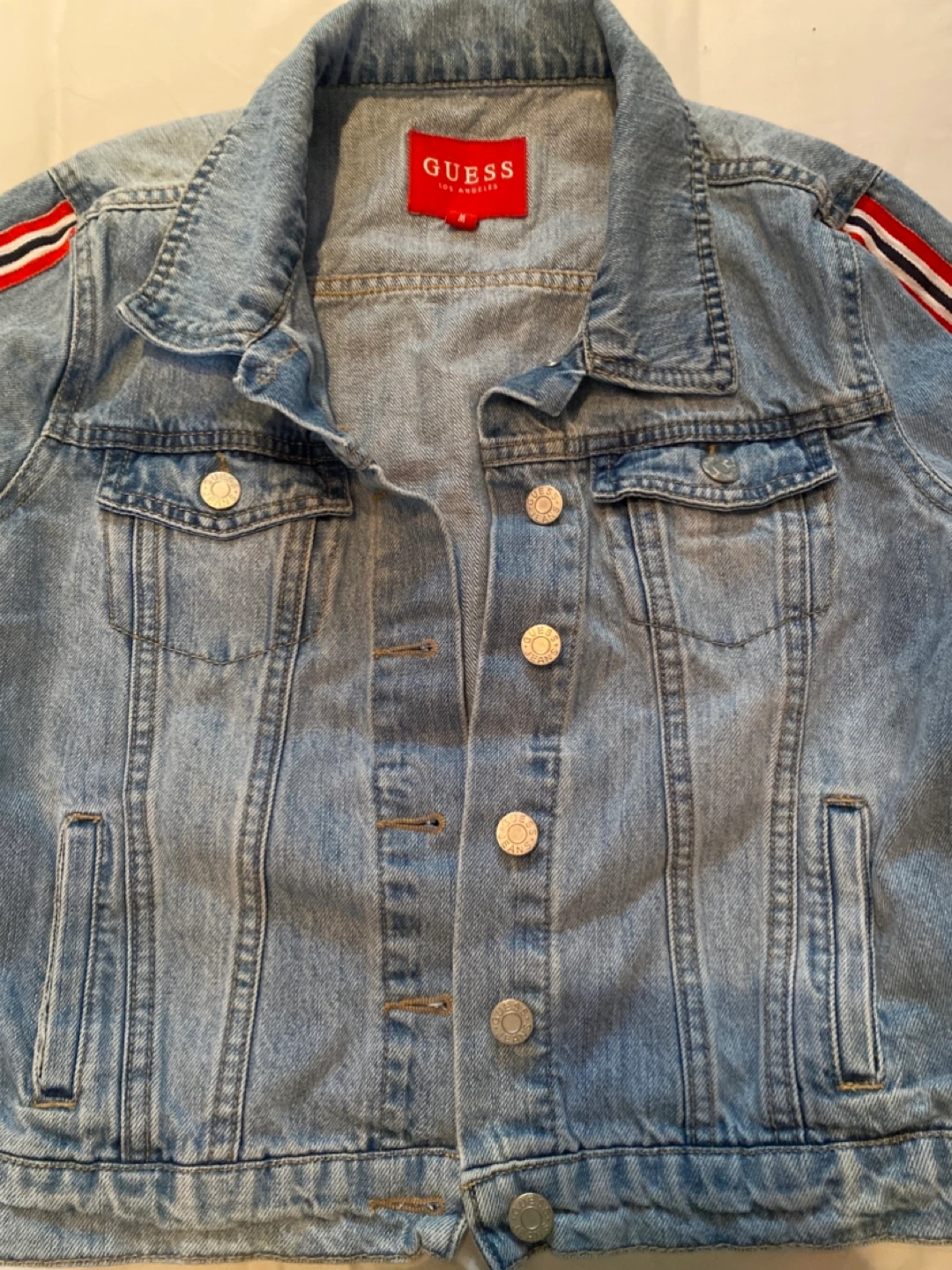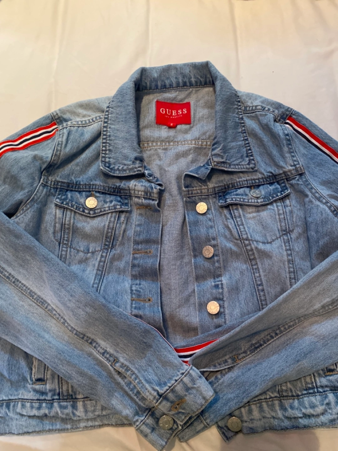 Women's light wash denim jacket. Features red and white striped detailing on the sleeves. Size Medium. All pockets open.
