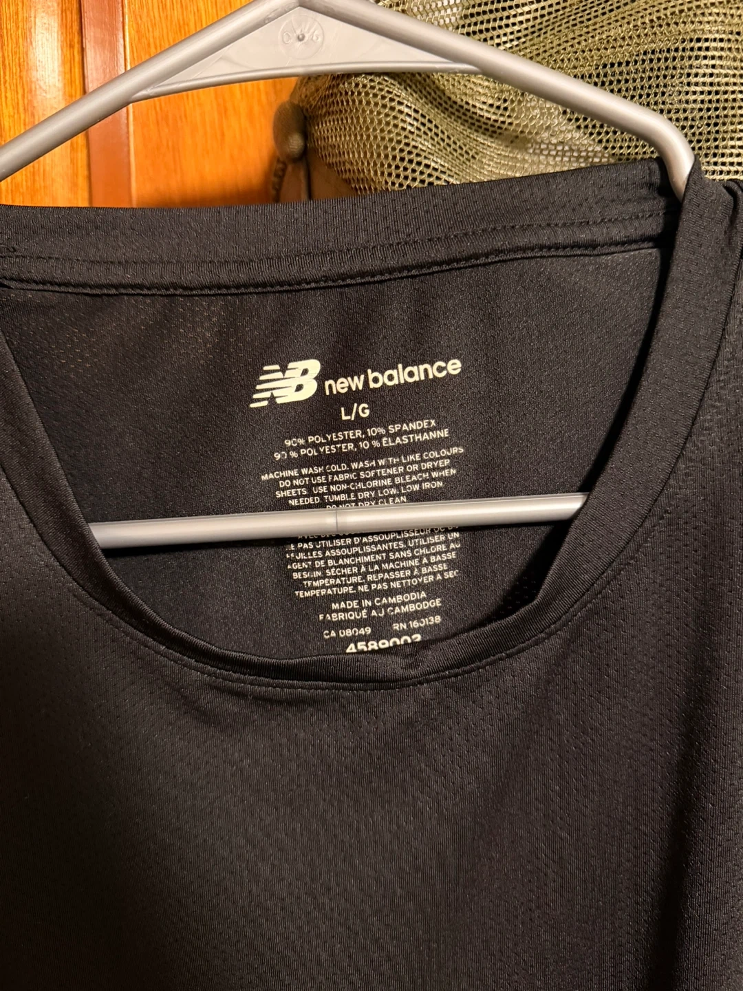 New Balance short-sleeve t-shirt in black. It's a size L/G. Made with 90% polyester and 10% spandex blend. Great for active wear! Door pickup only