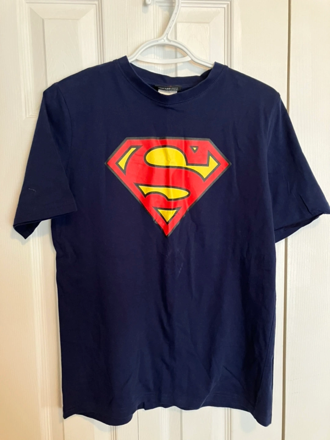 Navy blue Superman t-shirt. Features a large Superman logo on the front. Short sleeves, crew neck.
