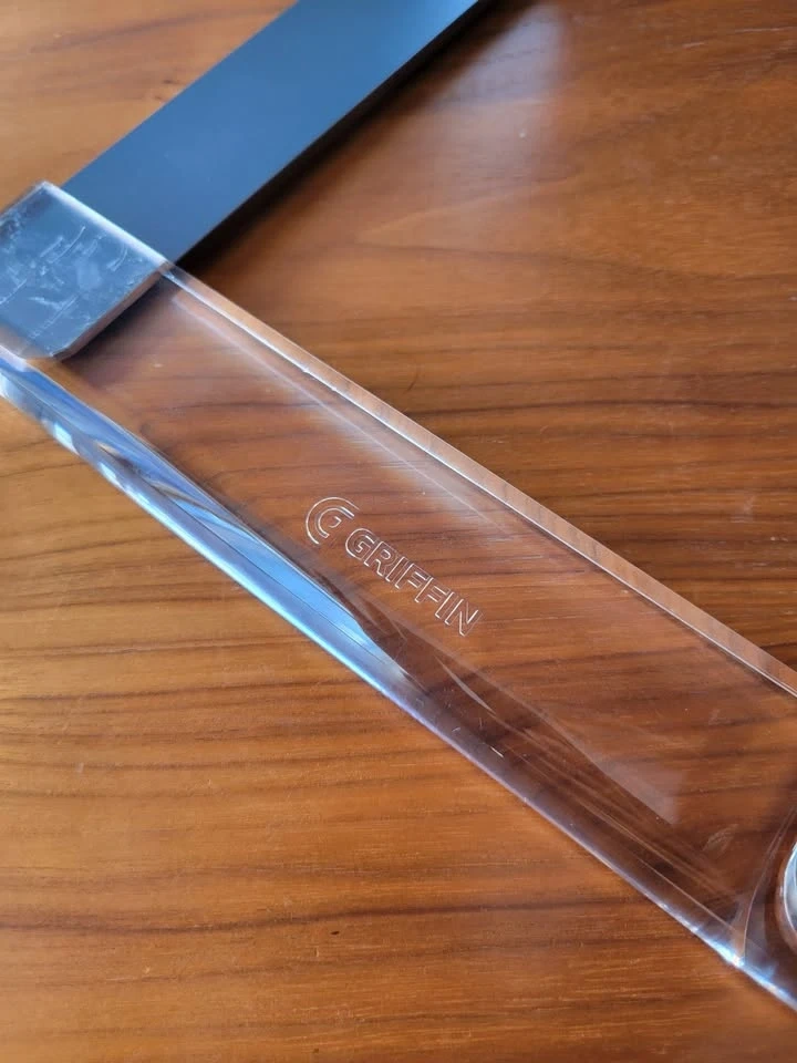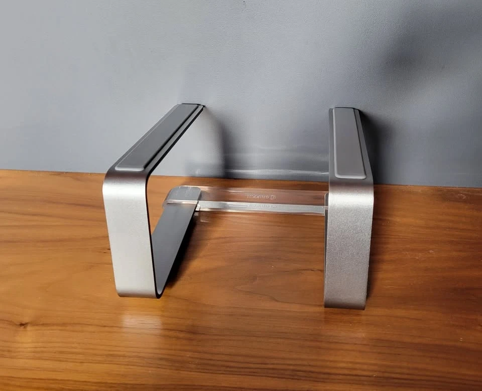 This is a sleek laptop stand from Griffin. It's made of brushed aluminum and clear acrylic. The stand elevates your laptop for better airflow and ergonomics.