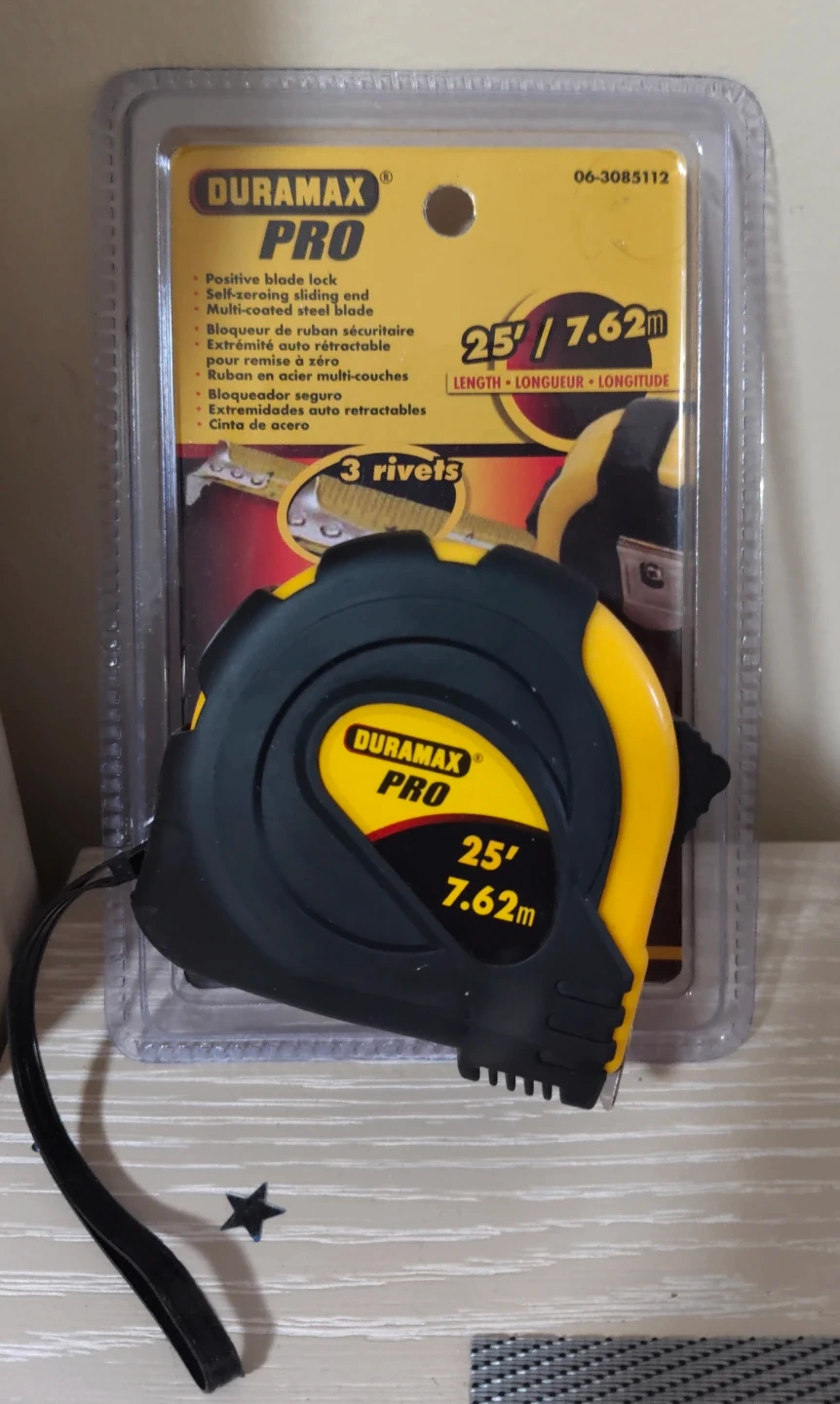 Selling a brand new Duramax Pro tape measure! It's 25 feet (7.62m) long and still in its original packaging. It features a positive blade lock, a self-zeroing sliding end, and a multi-coated steel blade. The package also mentions it has 3 rivets!