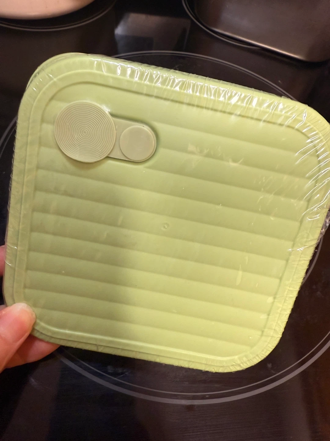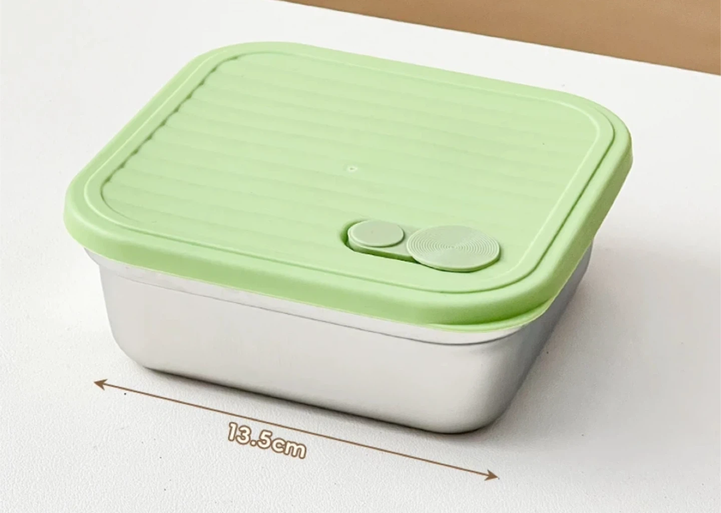 This is a stainless steel food container with a green lid. The container measures 13.5cm. It's made from 304 stainless steel and TPE.