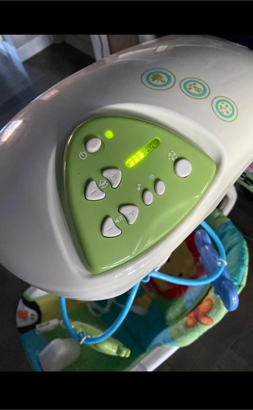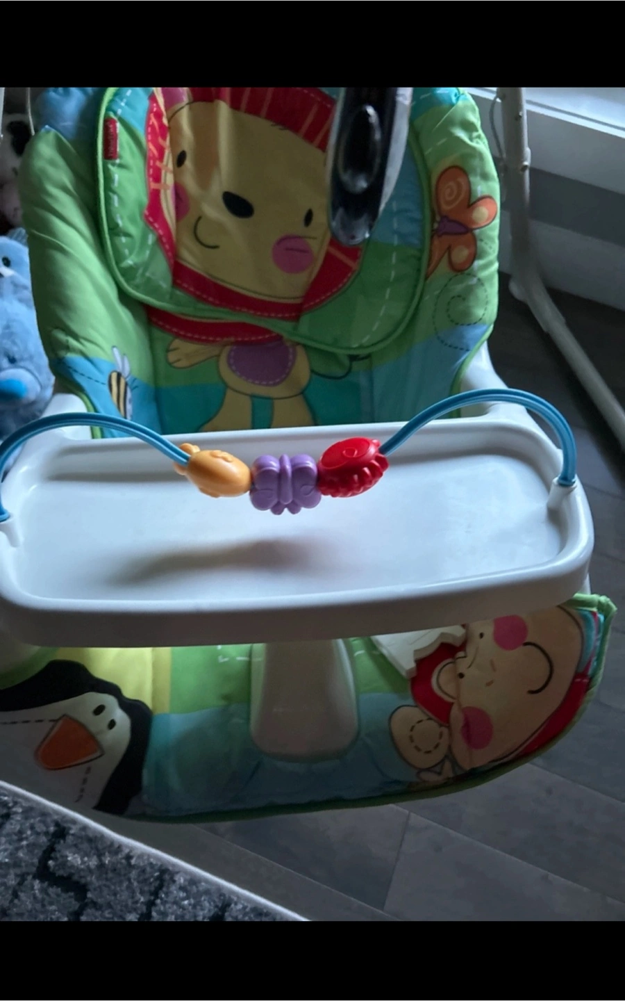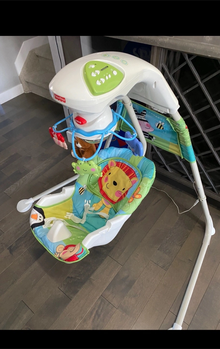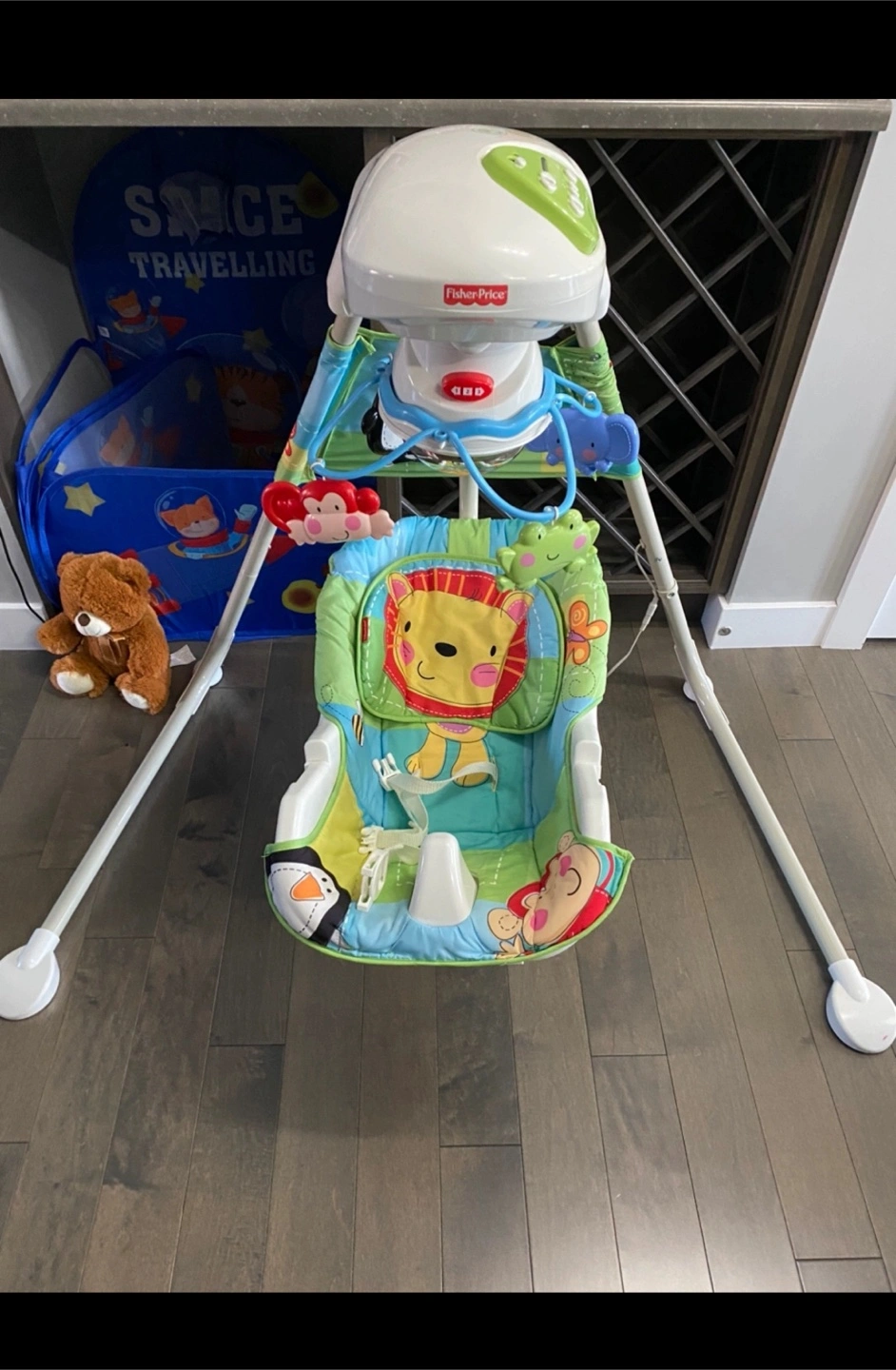 Infant swing, swings and plays music. Features multiple speed settings. Includes removable toy bar with hanging toys. Lightweight, easy to assemble and store. Great condition.