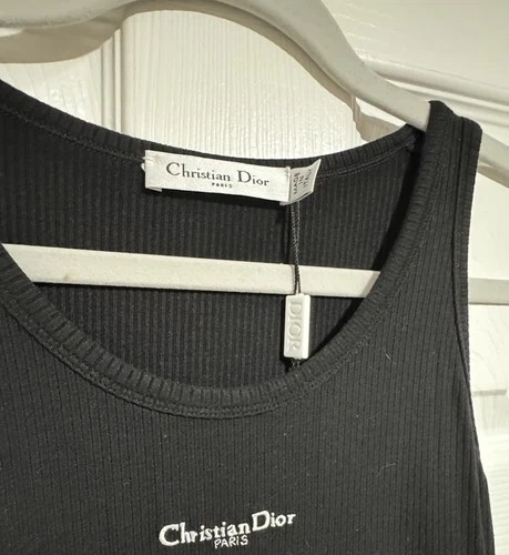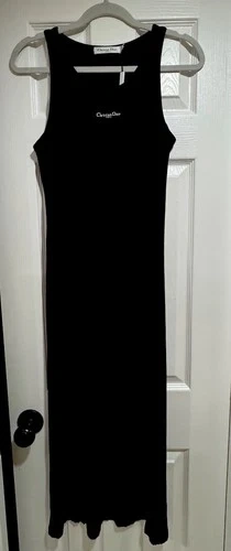 Authentic Christian Dior Paris sleeveless black ribbed dress, size M. Dress is new / unworn — brand label is present, original hang tag is missing. Elegant mid-length dress combining a sporty silhouette with couture style. Crafted from high-quality ribbed cotton jersey with Christian Dior Paris embroidery on the front. Features a straight cut, side slits, and a longer back hem for a modern, flattering look.