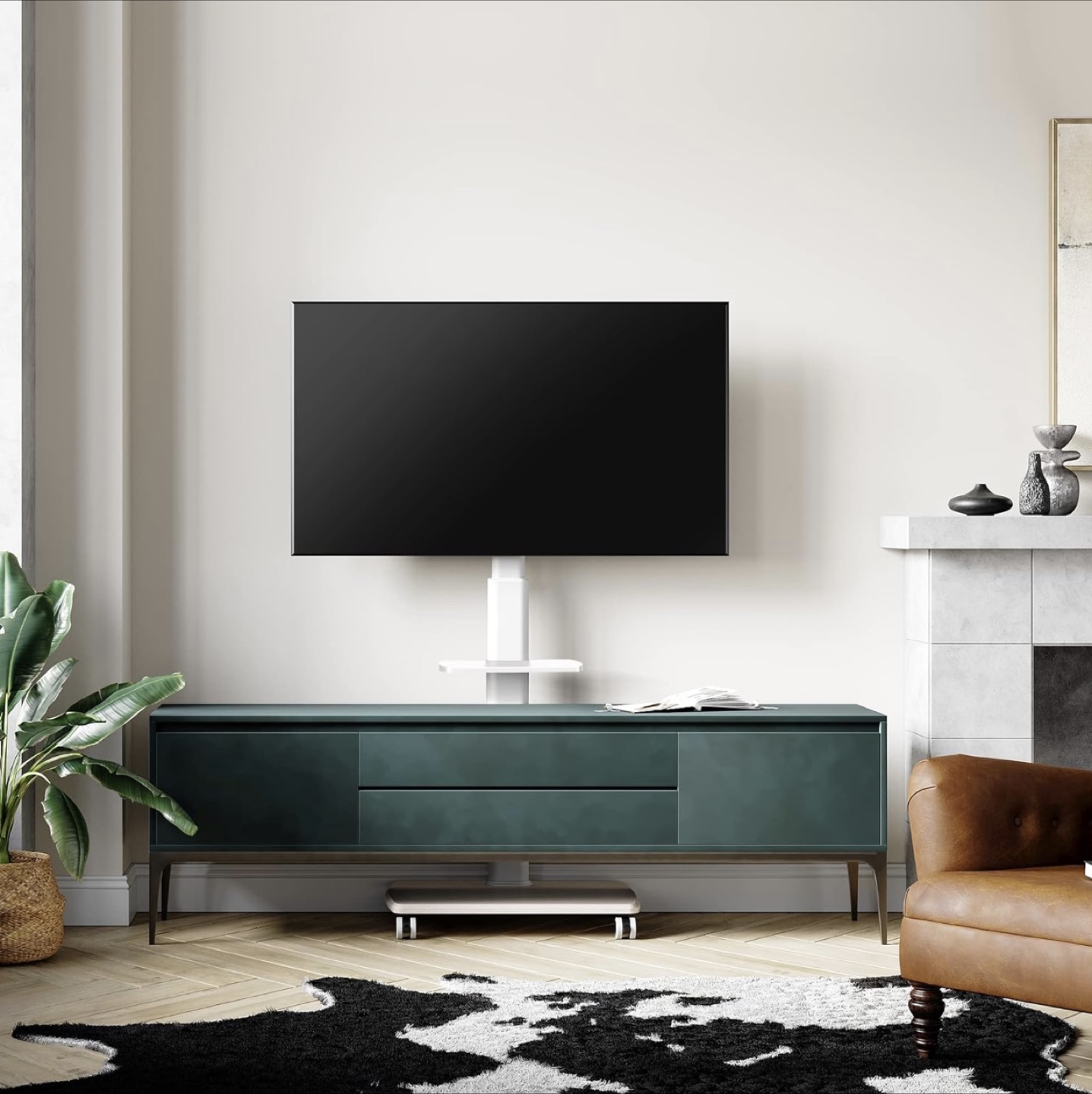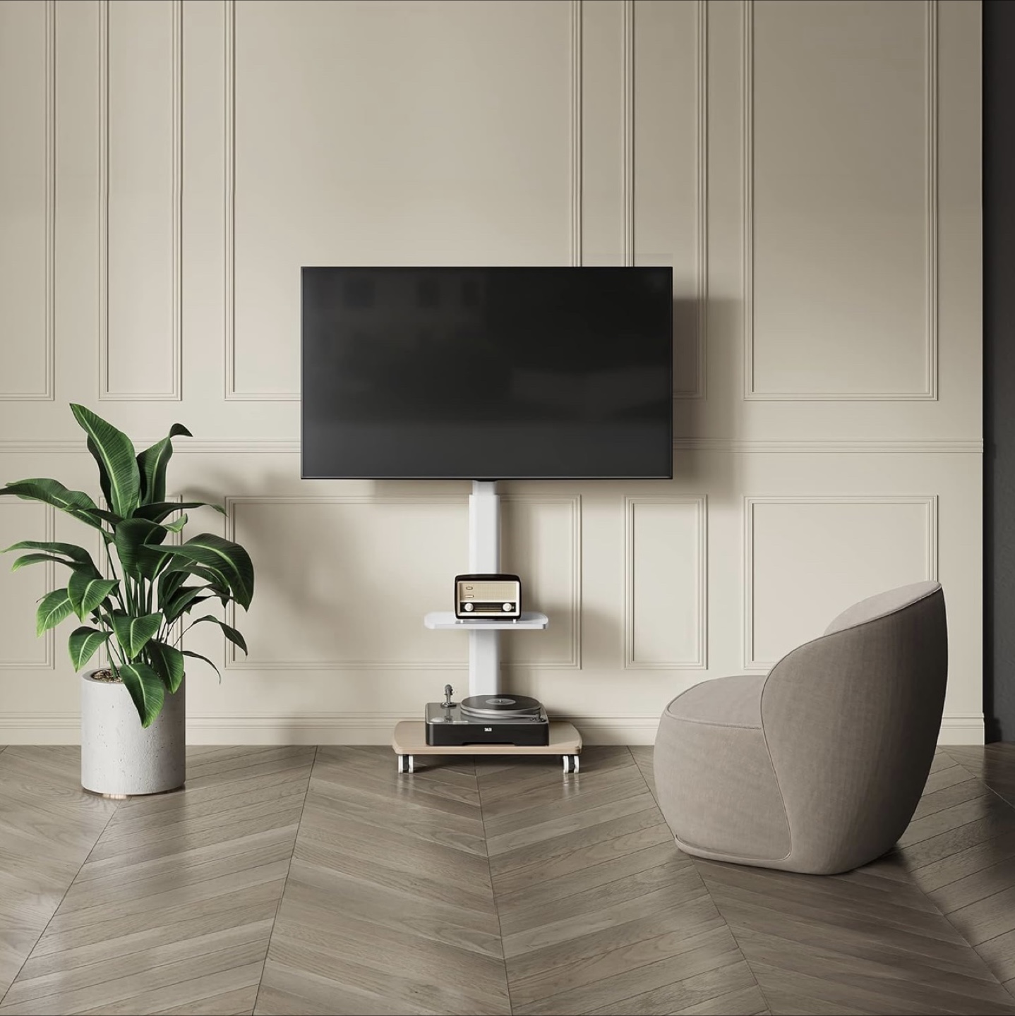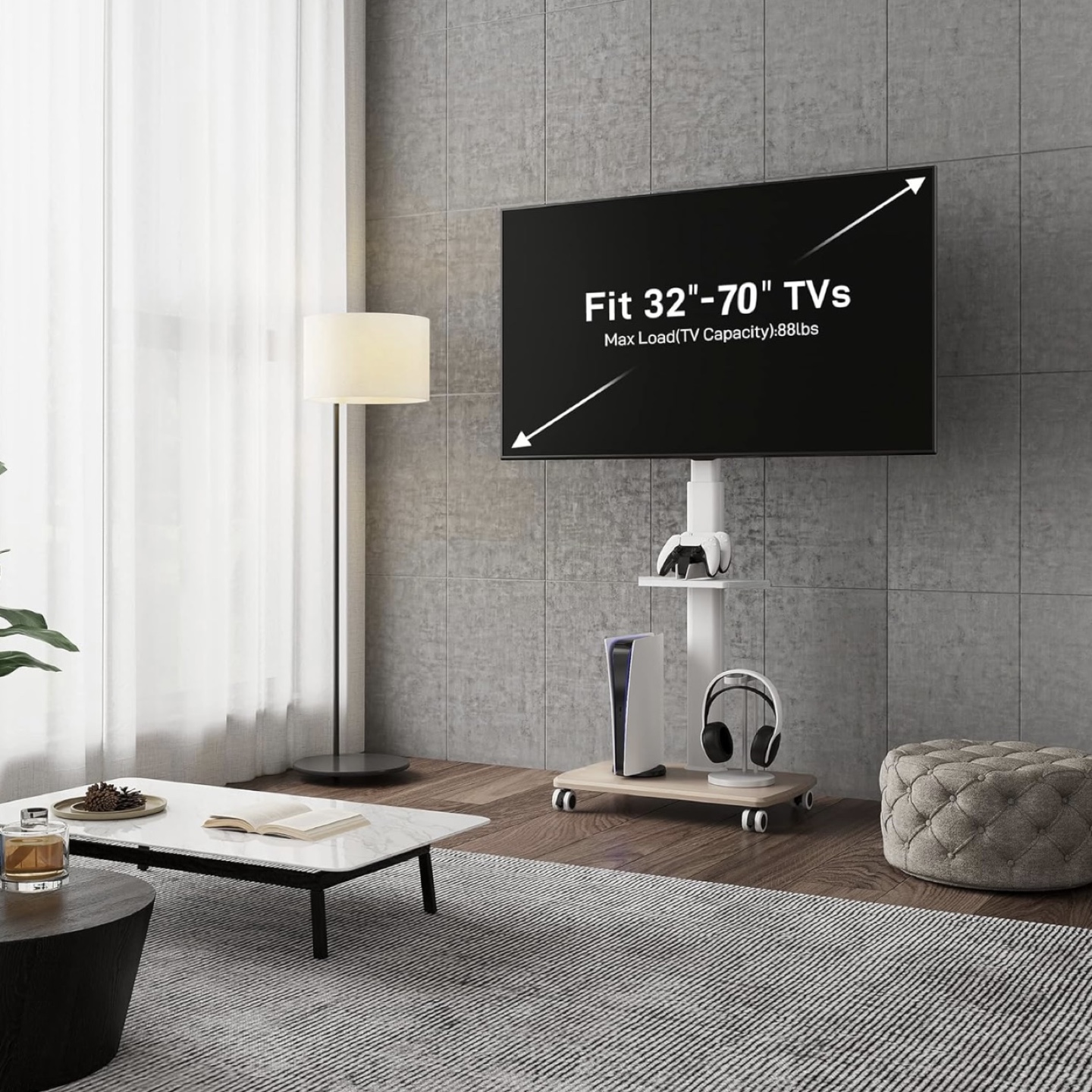 This rolling TV stand is perfect for TVs ranging from 32 to 70 inches. It can handle a max load of 88lbs. The base has a high-end wooden design and is more sturdy and safer to avoid breakage. The VESA compatibility ranges from 200x200mm to 600x400mm. The maximum height is 57.8 inches (1470mm) and minimum height is 50 inches (1270mm)