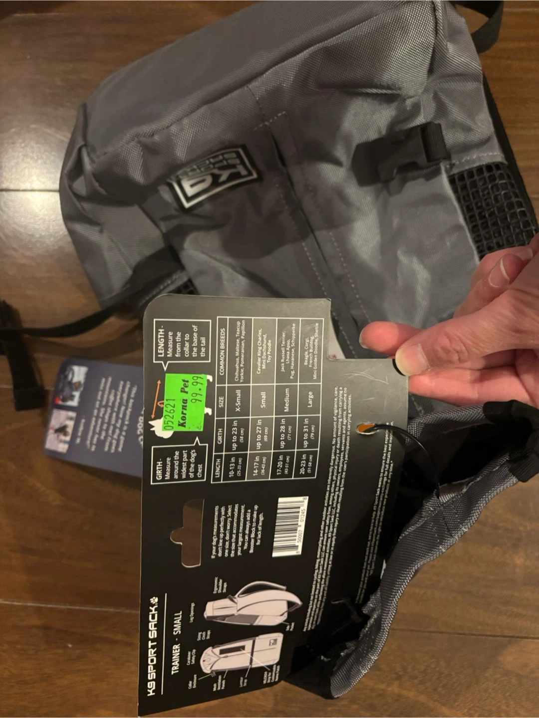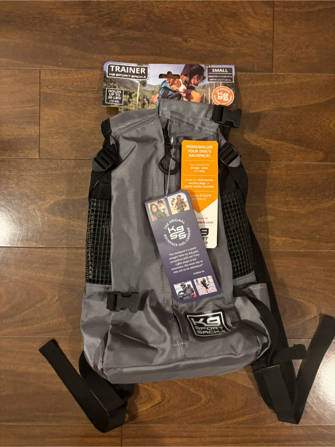 This is a K9 Sport Sack Trainer backpack for dogs. It's a small size and holds up to 30 lbs. The backpack is grey with black accents. It features adjustable straps and mesh panels.