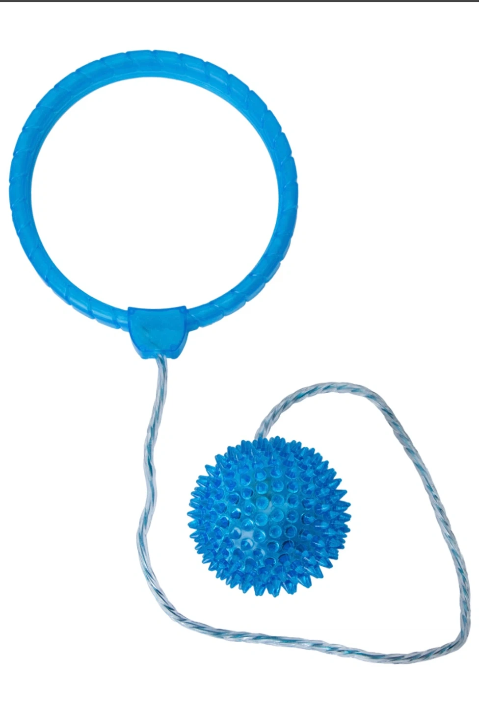 This is a blue skip ball toy with a textured ring and a spiky ball. It's made of plastic and has a braided cord. Fun for active play!you put it in 1 foot and swing it around and the other foot jumps over it!