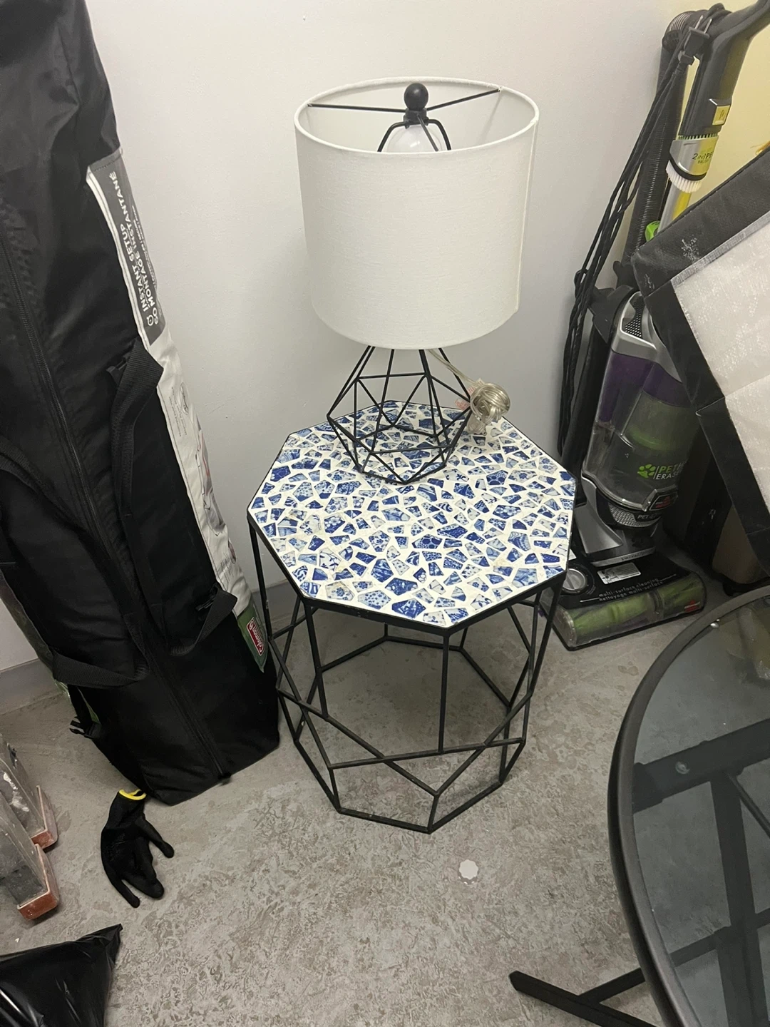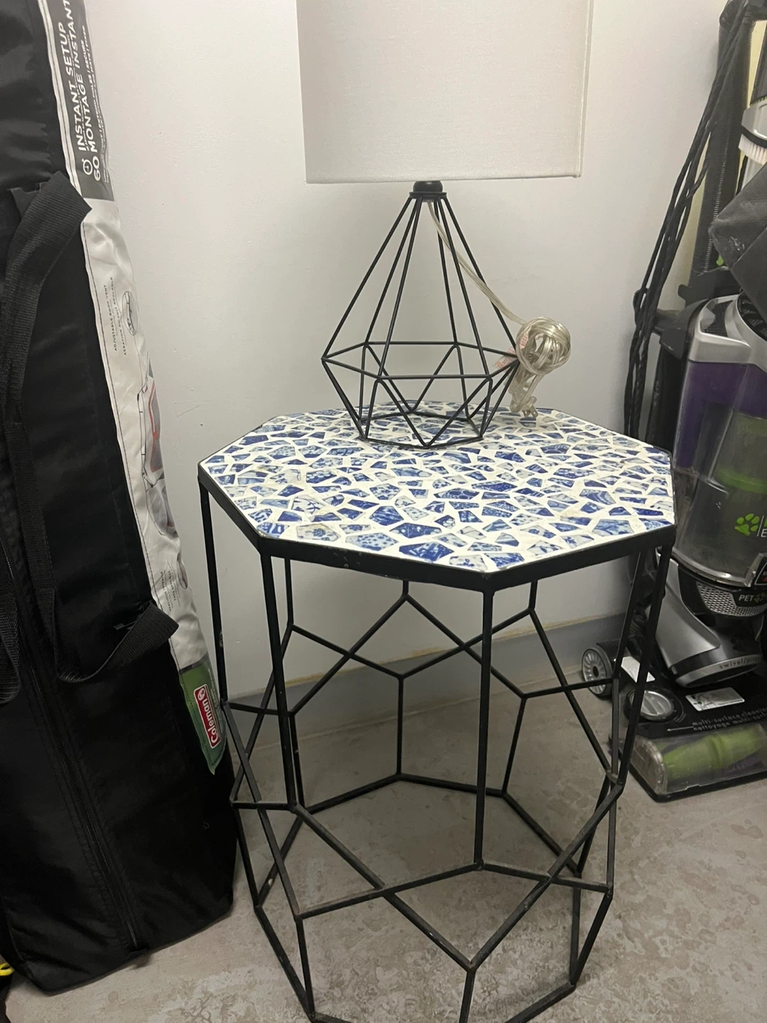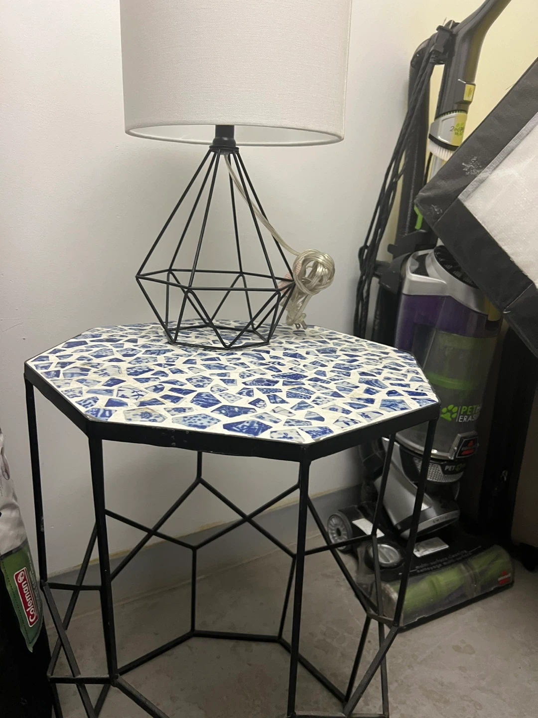 This hexagonal side table features a unique mosaic tile top in blue and white. The black metal frame has a geometric design. It's a stylish accent piece for any room. Dimensions are approximately 20" tall and 18" wide.and lamp
