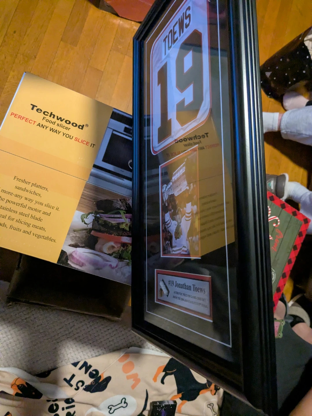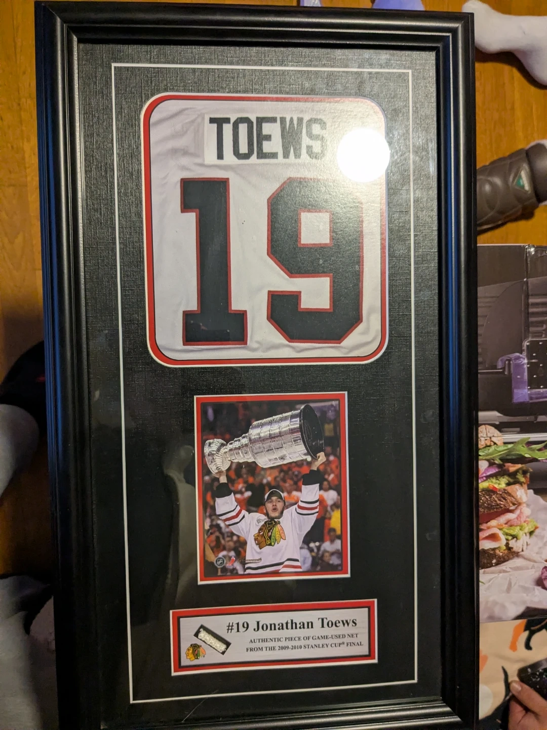 The display includes a replica jersey with Toews' name and number (19), a photo of him holding the Stanley Cup, and a small swatch of the actual game-used net.
