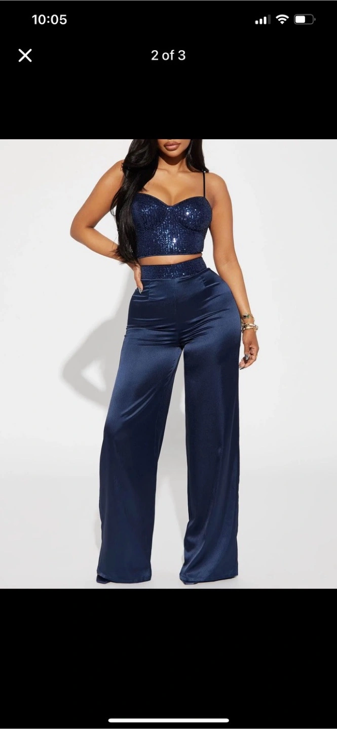 A two-piece outfit. Features a crop top with sequins. High-waisted pants with a wide leg. Message for more information.