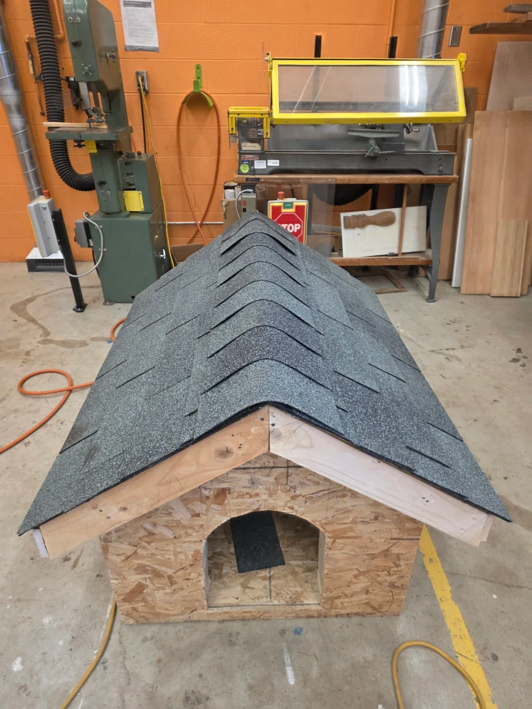 Solidly constructed wooden dog house, ready and Features a sturdy frame and a weather-resistant shingled roof for protection. Interior is spacious and well-supported. A great project and a cozy home for their furry friend. This shelter is built to last!