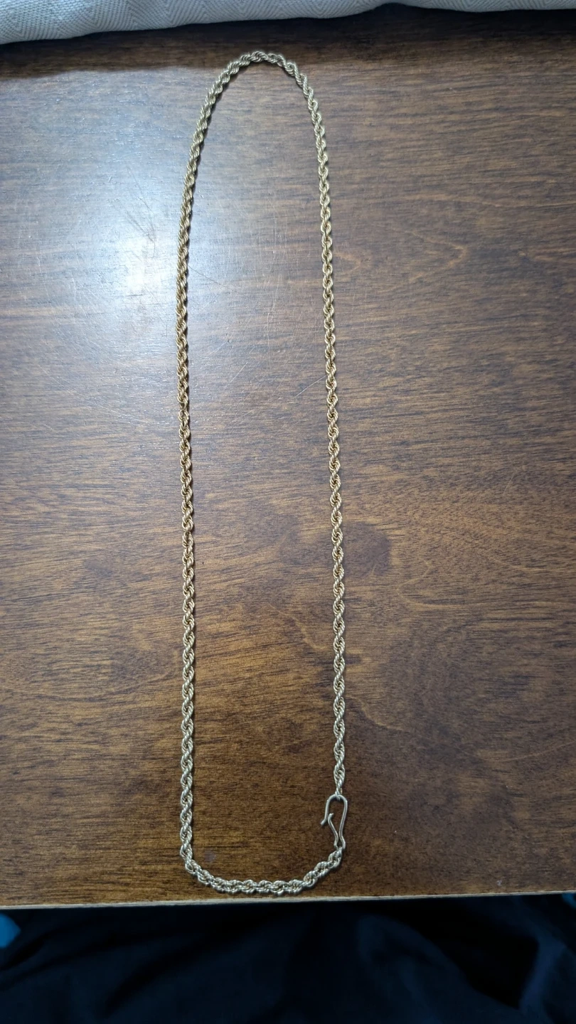 A classic gold rope chain necklace. 10k Gold and weighs 4 grams. It's a timeless accessory that adds a touch of elegance. Open to offers!