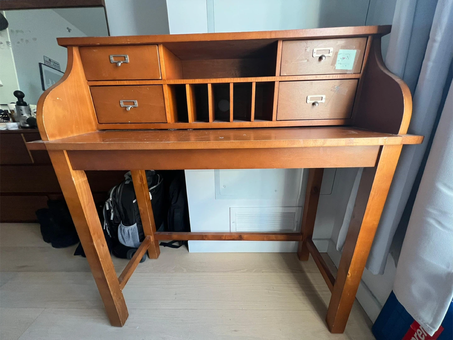 This is a vintage wooden secretary desk. It features multiple drawers and cubbies for storage. The desk has a warm wood finish and a classic design. Perfect for a home office or study area!