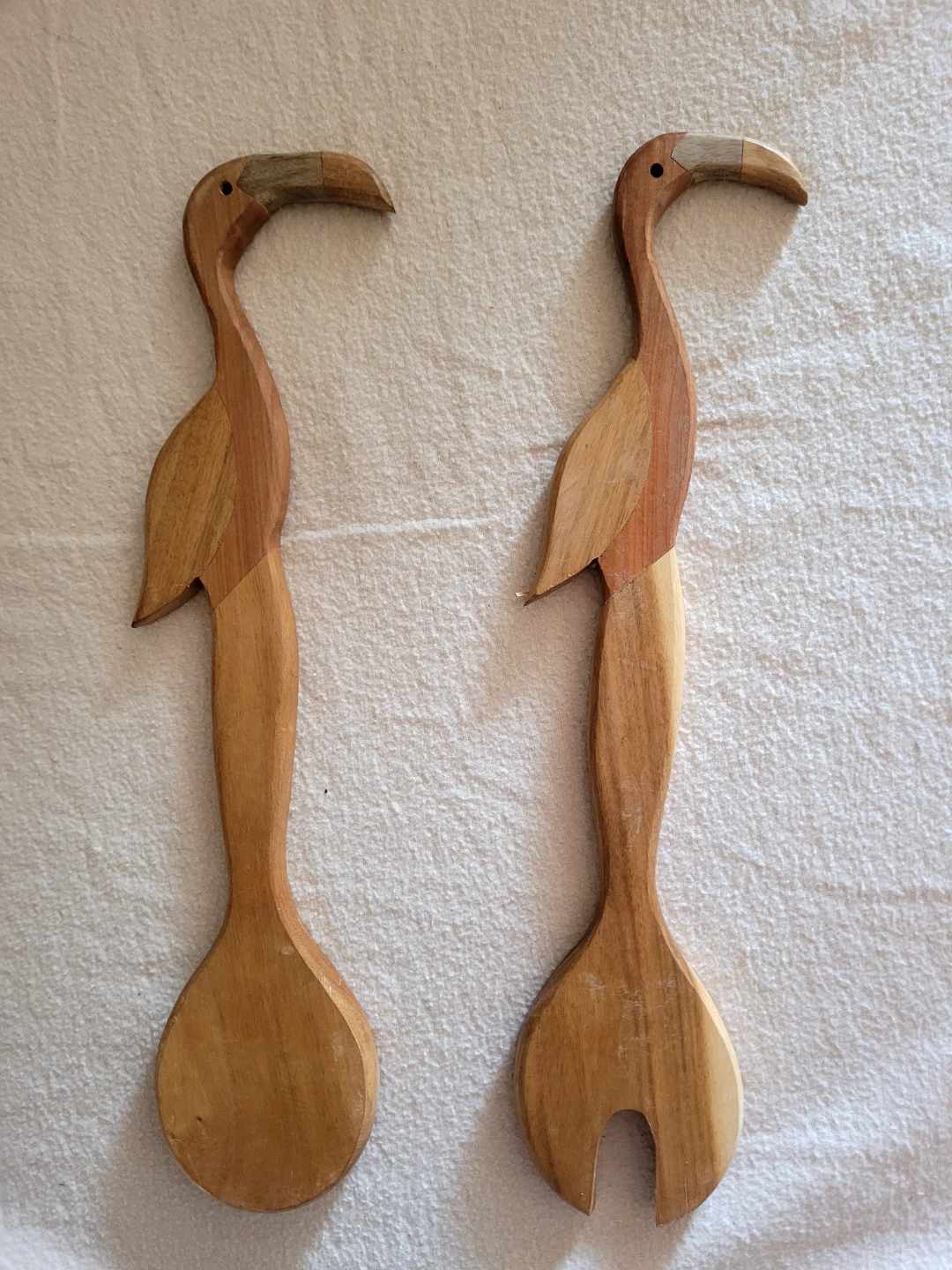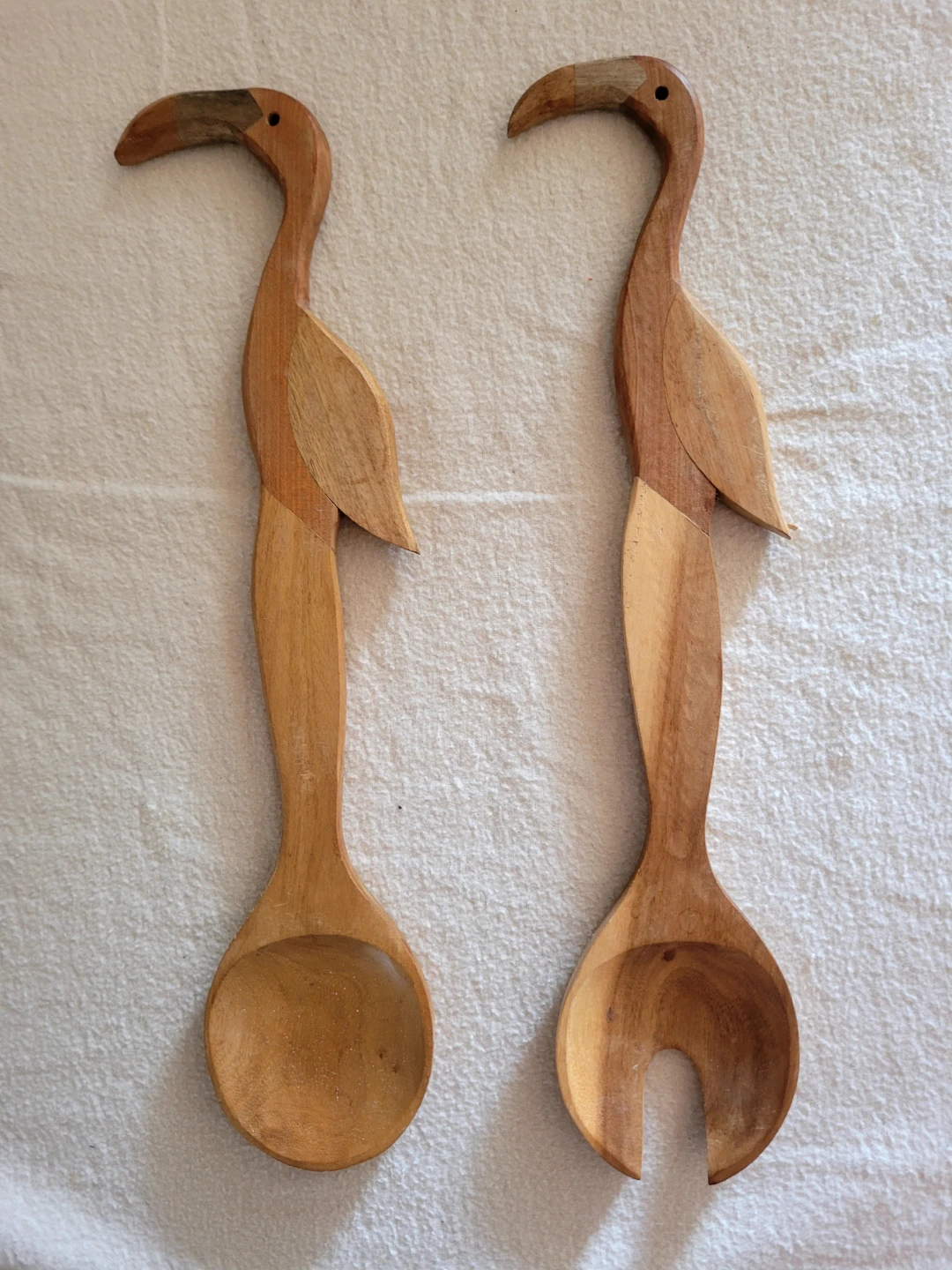 Here's a unique wooden salad serving spoon set! These spoons are shaped like birds, adding a touch of whimsy to your table. They're in great condition and ready to serve up your favourite salads