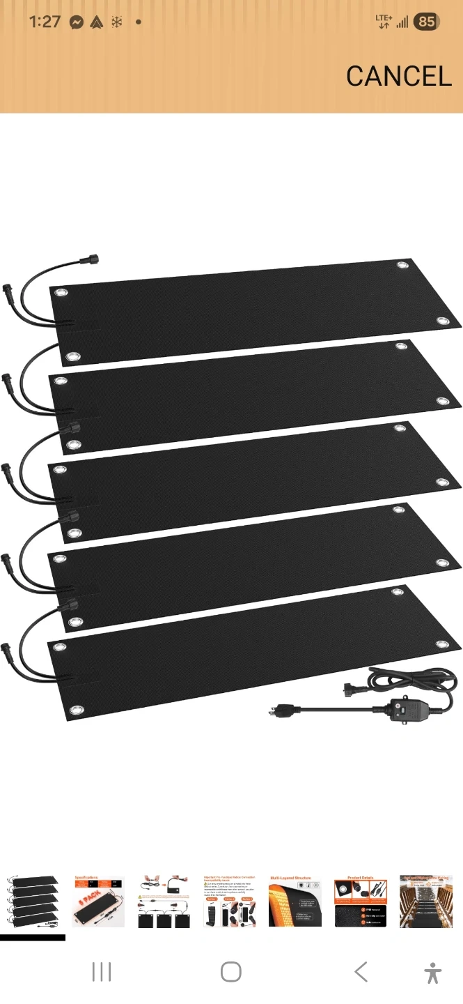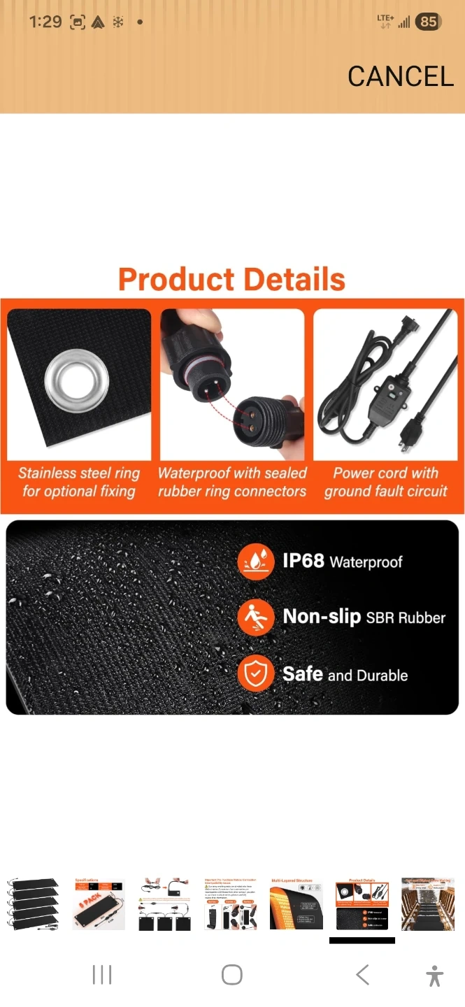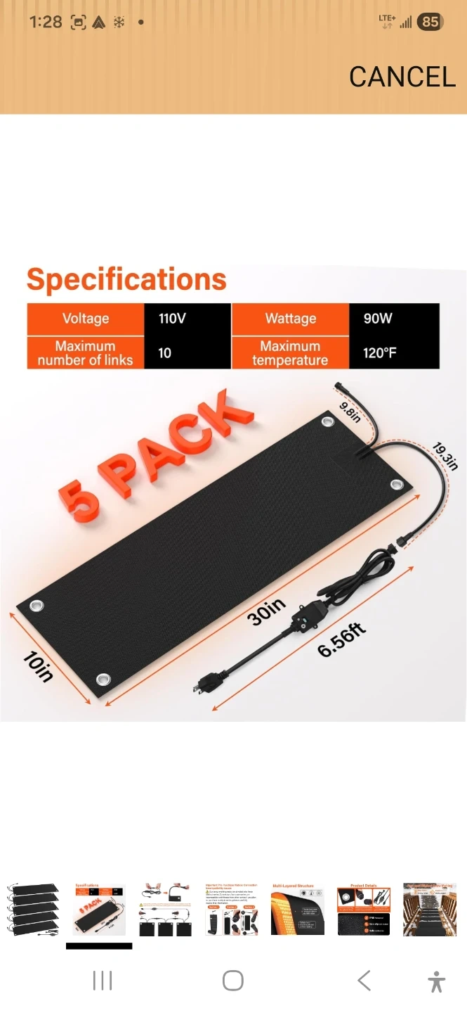 This is a 5-pack of heated snow melting mats. Each mat measures 30 inches by 10 inches. They feature a multi-layered structure with a double-layer wear-resistant and non-slip SBR rubber. The mats have a cellular fever structure for safe and uniform heating. They operate at 110V and consume 90W, with a maximum temperature of 120°F. These mats are designed to prevent ice and snow buildup.
