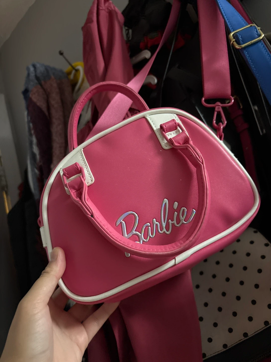 Check out this adorable Barbie handbag! It's a vibrant pink colour with white trim and features the Barbie logo in silver lettering. Perfect for adding a pop of fun to any outfit!