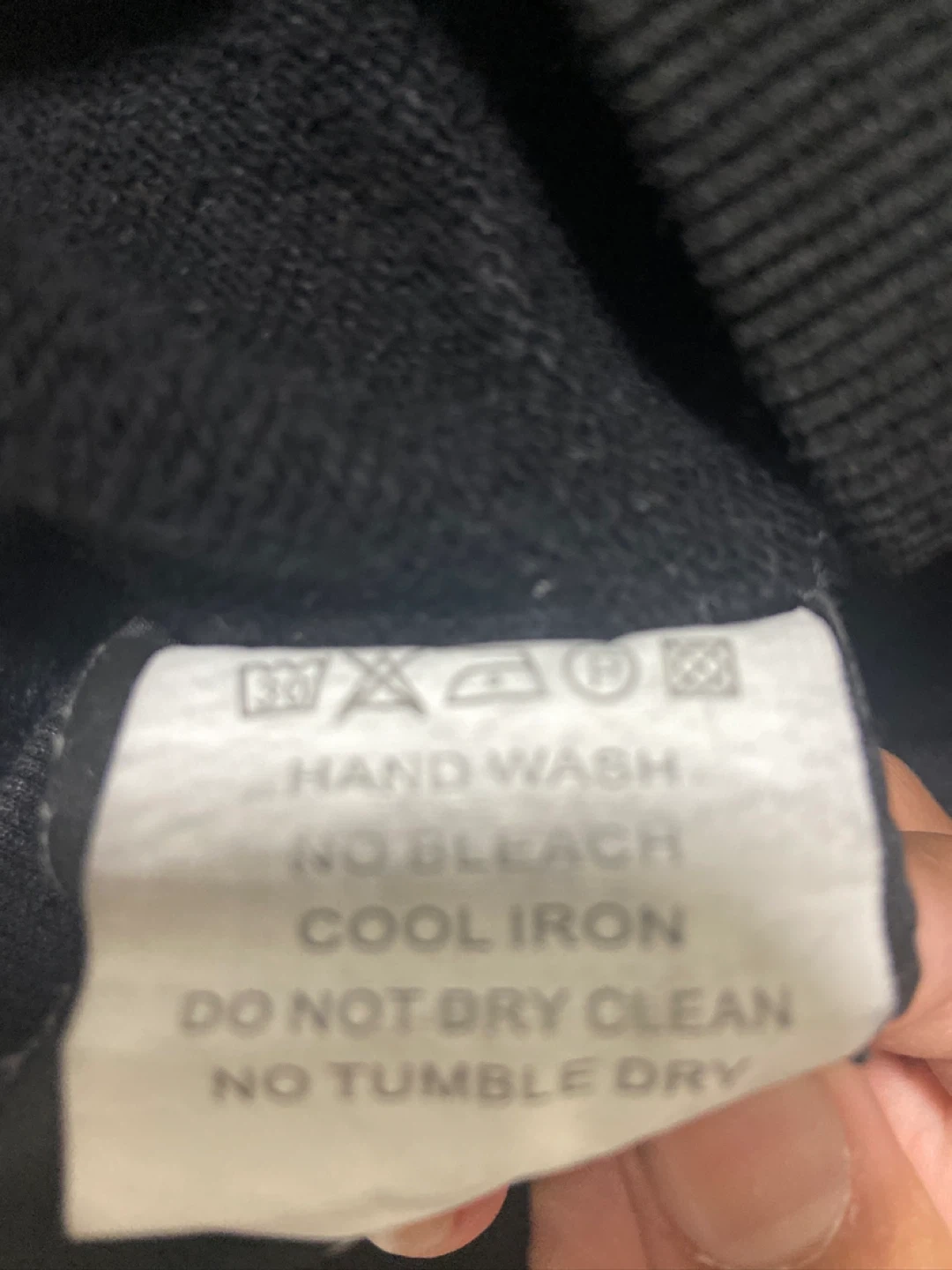 This black hoodie from Denim Tears features a unique floral pattern. It's made in the USA and has a size L tag. Care instructions include hand wash, no bleach, cool iron, do not dry clean, and no tumble dry.